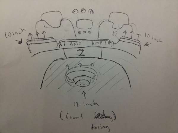 If you stick the amp out in the open like that, be sure to install a really good alarm system as well. I also agree on dumping the 12" and turning the 10's to the rear. The longer the travel, the better. Don't skimp out on the subs. Get the best you can buy. If you're doing this for looks alone than the photo you posted looks fine. From a SQ perspective, it's going to sound like crap though, and you'll be lucky if your hearing isn't shot after a few years. It's probably a silly question, but are you only interested in loud bass as opposed to a more balanced sound?