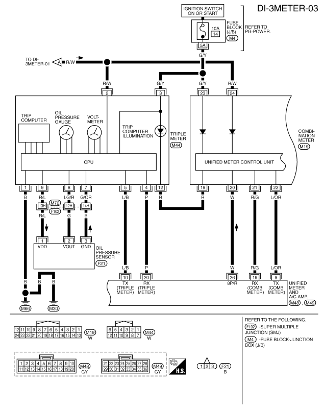 The battery voltage, I am 99% sure is transmitted throught the TX/RX system or possibly through pin #19 on connector M44 (which talks to the combination meter). There are no other logical pins on connector M44 that look like they handle the battery voltage. And I suspect the digital multi gauge uses the TX/RX as well.