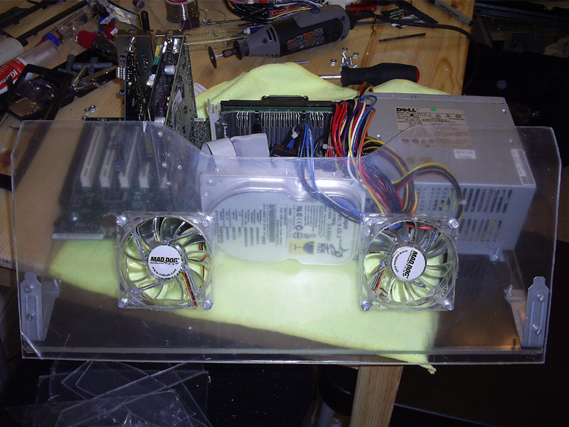 I started off with this old Dell I had from back in 2000. 700mhz Pentium 3 old, that doesn't work. I tinker and tinker and get it to work. So I put together a plexiglass frame, throw in some fans and pick up a Lilliput 7" wide touch screen.