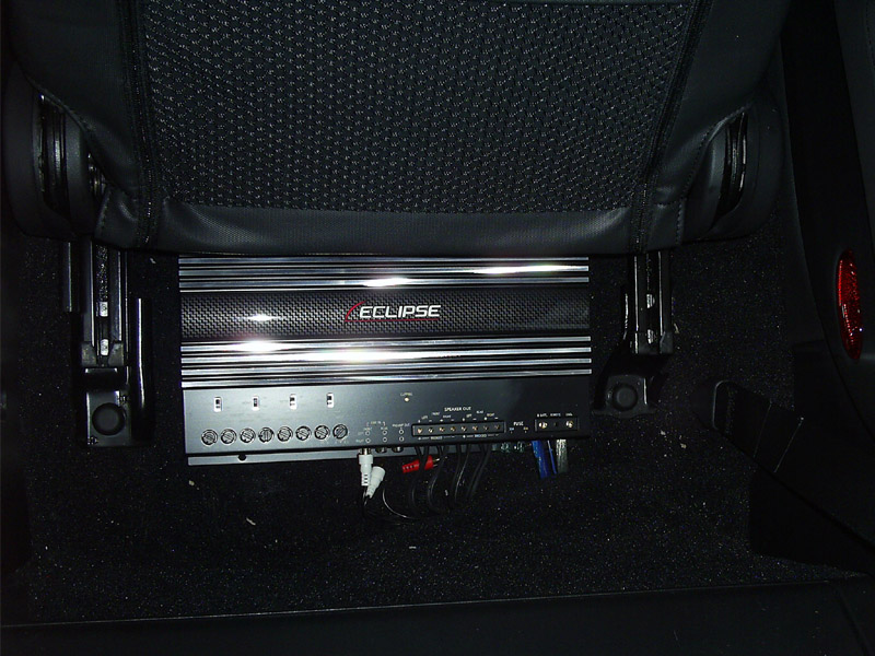 So you are probably wondering how I get sound. Funny enough, a sound card hooked directly into a 4 channel amp sounds pretty good. Especially considering how old the card is, it works ok. New computer and surround card are coming, thus the 2 loose RCA cables not being used for now. The Z is great, tons of room under the seats. This one is under the passenger side. The sub amp will go under my big ol' butt.