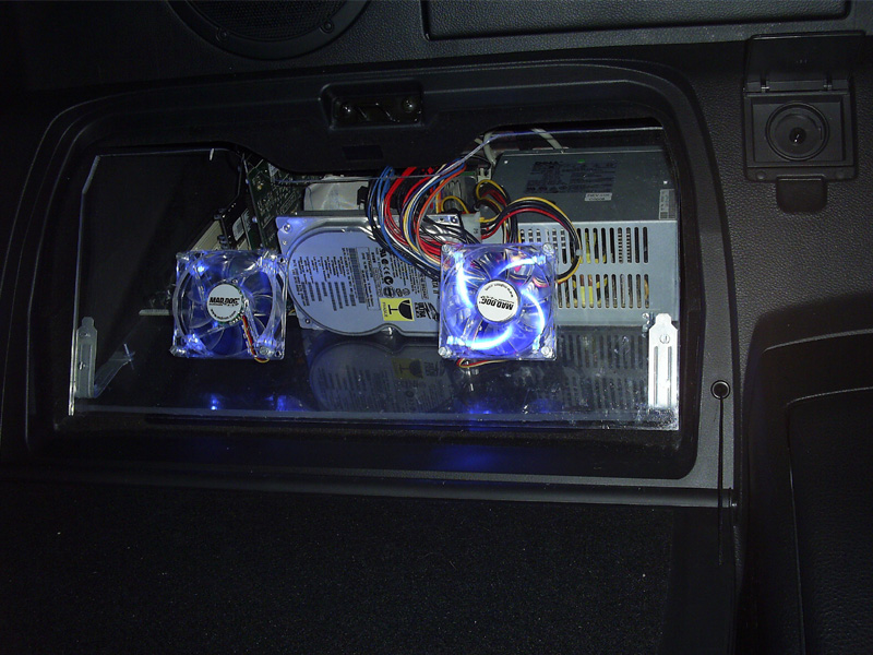 I think this part is the coolest. It looks like crap on the bench with the plastic covering on the plexi. In the car, the template I made really paid off, cause it fits like a glove. The fans are blowing in opposite directions so it creates pretty good circulation. And because I cut out the back of the glove box area, cool air from inside the chassis is alowed to circulate. Haven't overheated yet.