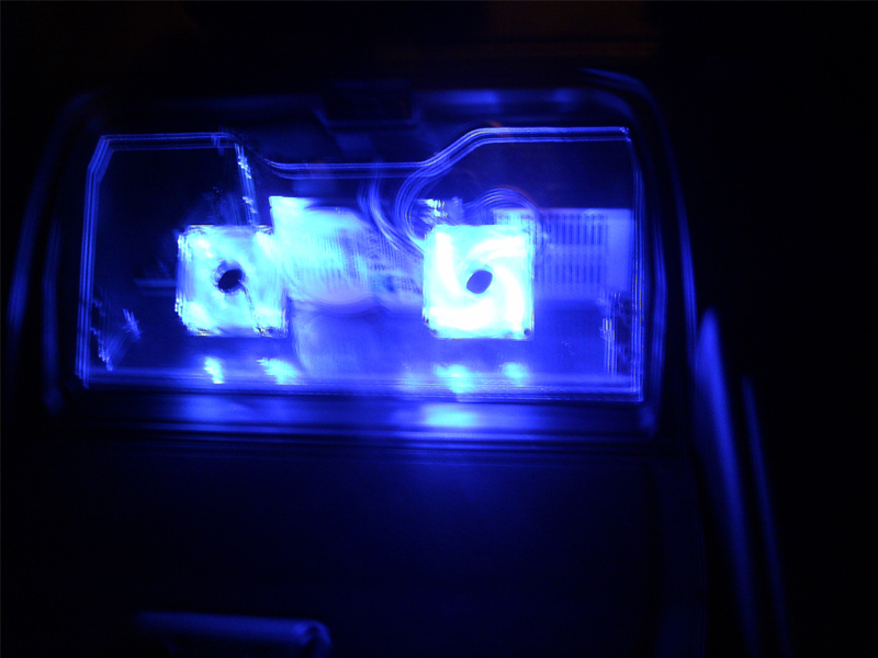 Here are some with the lights off, and the blue fans kickin'!! Again, sorry for the poor quality. I held it really still but it still came out blurry.