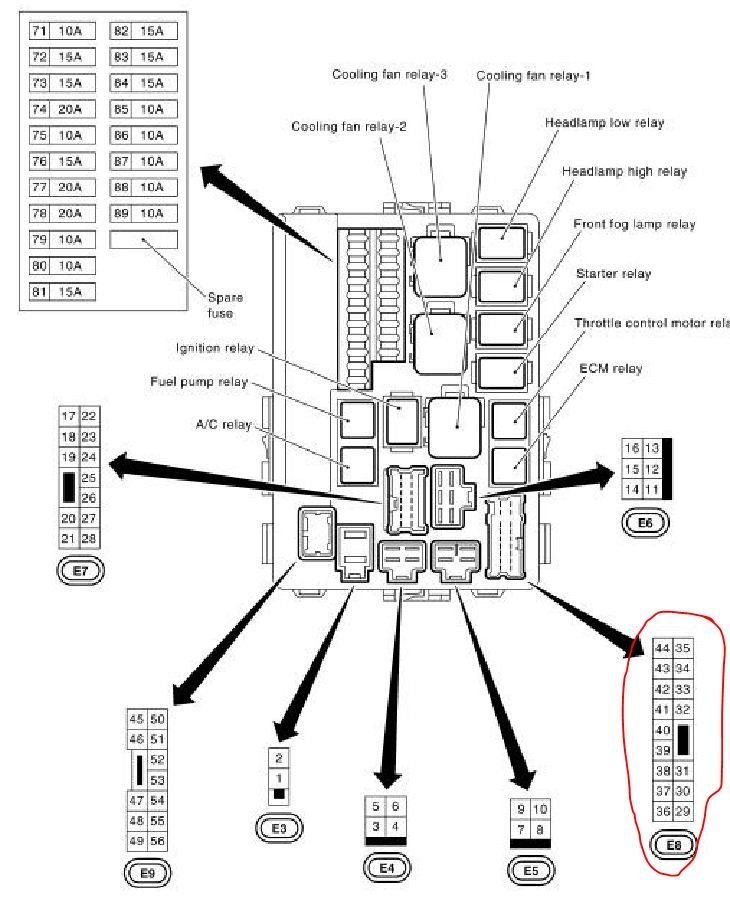 Ok, in the back side of my 03 350z's Ipdm the wires have come out of the connector. There's not any wiring diagram that I can find. I need a picture of the back side of the Ipdm connector e8 pin 22-42 or wire color code with corresponding pin #