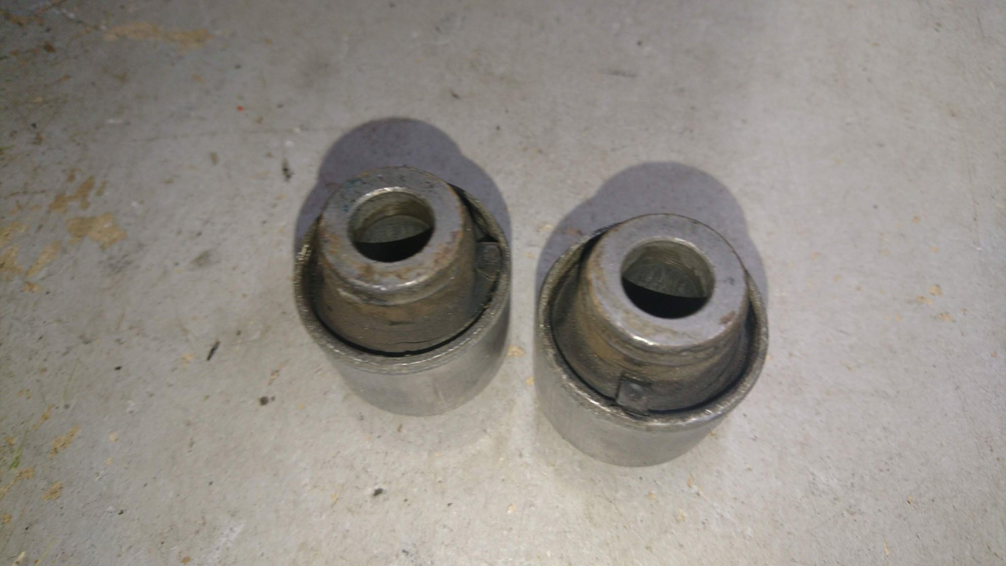 Back after a few months of home renovations, finally pulled the car out of storage and started working on it again. Went to install the SPL adjustable front sway bar links and found a problem. Started out with the car on ramps so the suspension was loaded I realized the Megan Racing sway bar was actually hitting the inside of the passenger wheel well and binding. Ugh... that might explain some of the handling issues I've been experiencing. Upon closer inspection it appears the sway bar has shifted about 1/4" to one side which was enough to hit metal. The megan sway bar has built-in centering rings just like oem but noticeably thinner and there is just enough side-to-side play to become a problem. Ended up having to make a spacer to sit next to the driver's side ring to keep the sway bar properly centered. With this sorted I way able to install the new end links and adjust them for no preload, that required turning the driver's side link out about 5 revolutions (probably 1/3" or so). Considering both sides are sitting at even height, exactly 25" fender to ground, not sure why the difference in end link lengths, maybe the Megan sway bar is also slightly twisted, wouldn't surprise me at this point. I'll be doing the rear strut bushings in the next few days, they are currently cooling in the freezer to make them easier to press in.