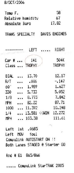 I agree the 60ft time will affect trap, but I have never seen it have that big of an impact (literally 6-7mph on a car this slow? maybe if it was a "ow 12 high 11 car?). I'll scan the slips today at my office, but DA and temp is not listed. I'm still running the stock tires (13k miles on car). Interestingly both times I left it in third I hit my rev limiter right before getting through the traps and in both instances trap speed was 100.xx. I am not sure what the gearing/mph should be on this car.