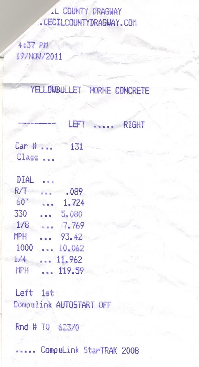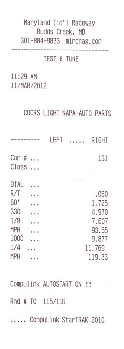 Touchup tune by Vince@RTT added ~7mph to my traps, this was my 8th run tonight, pulled another 11.9 a couple runs later with the same 60' and trap. Car feels very, very strong I still have driver mod left to do.