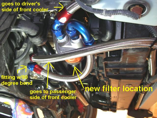 I have to say I'm pleased with the cooler mounting location, but it would look better if I had an aftermarket bumper. The OEM intake scoop is a bit higher than what I've seen on aftermarket bumpers. As you can see in the picture, it blocks the lower portion of the cooler. It's something I might have to live with since I have the Veilside lip kit.
