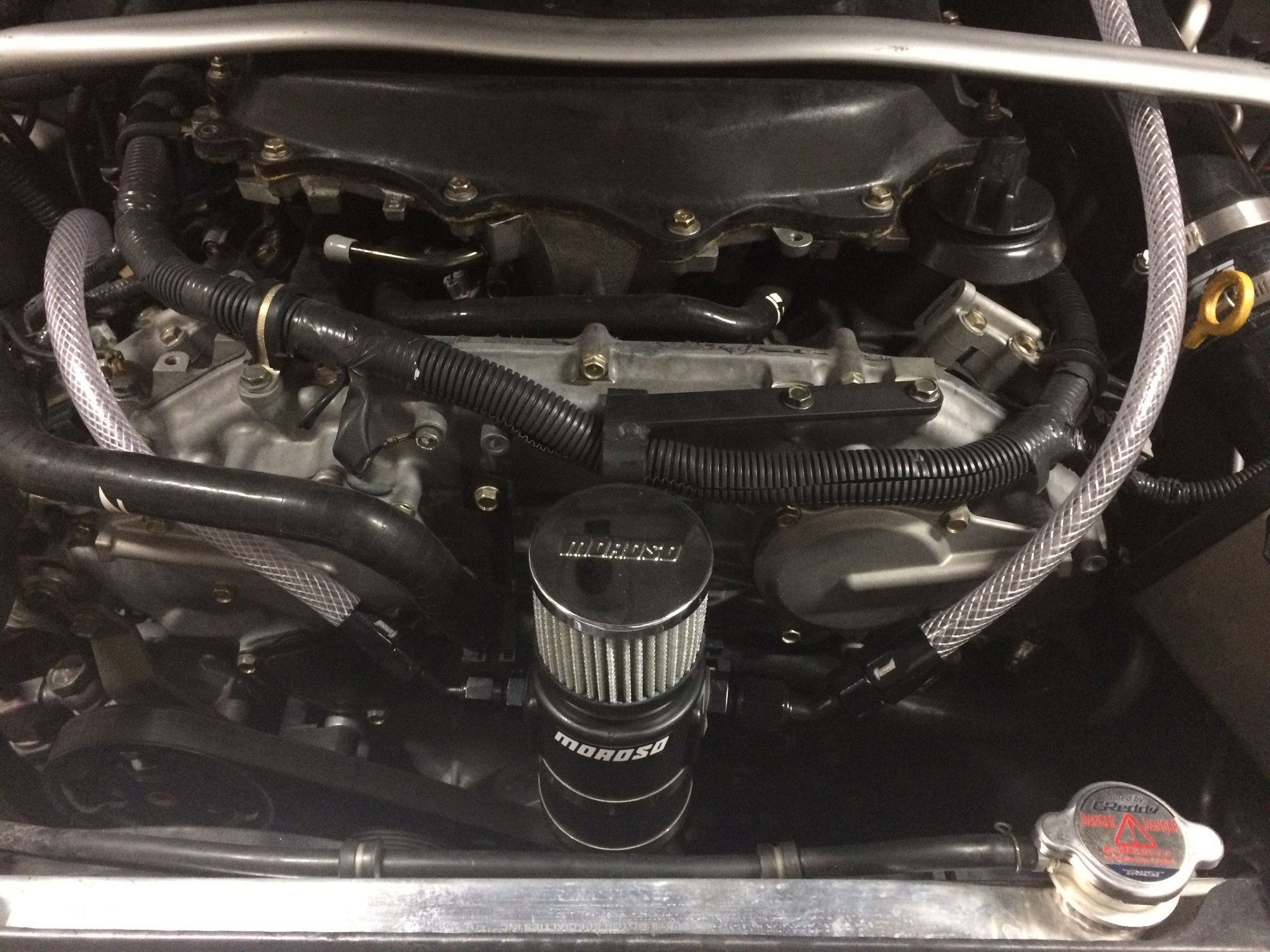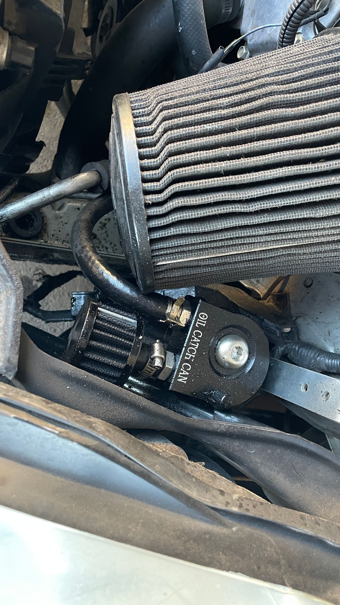 Bought the car and the driver rear pcv port had a little breather filter on it, which was greatly leaking oil all over the exhaust, transmission, and undercarriage. So I removed the breather filter and routed a hose from there to my catch can and Td into the intake side.