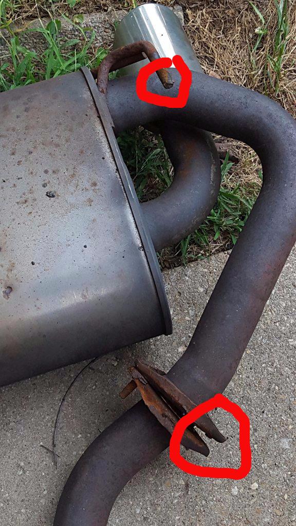 2. A bolt between the muffler and straight pipe broke due to rust. As you can see, this bold head seems to be stuck in there. If you can remove it, then another bolt/washer will work just fine.