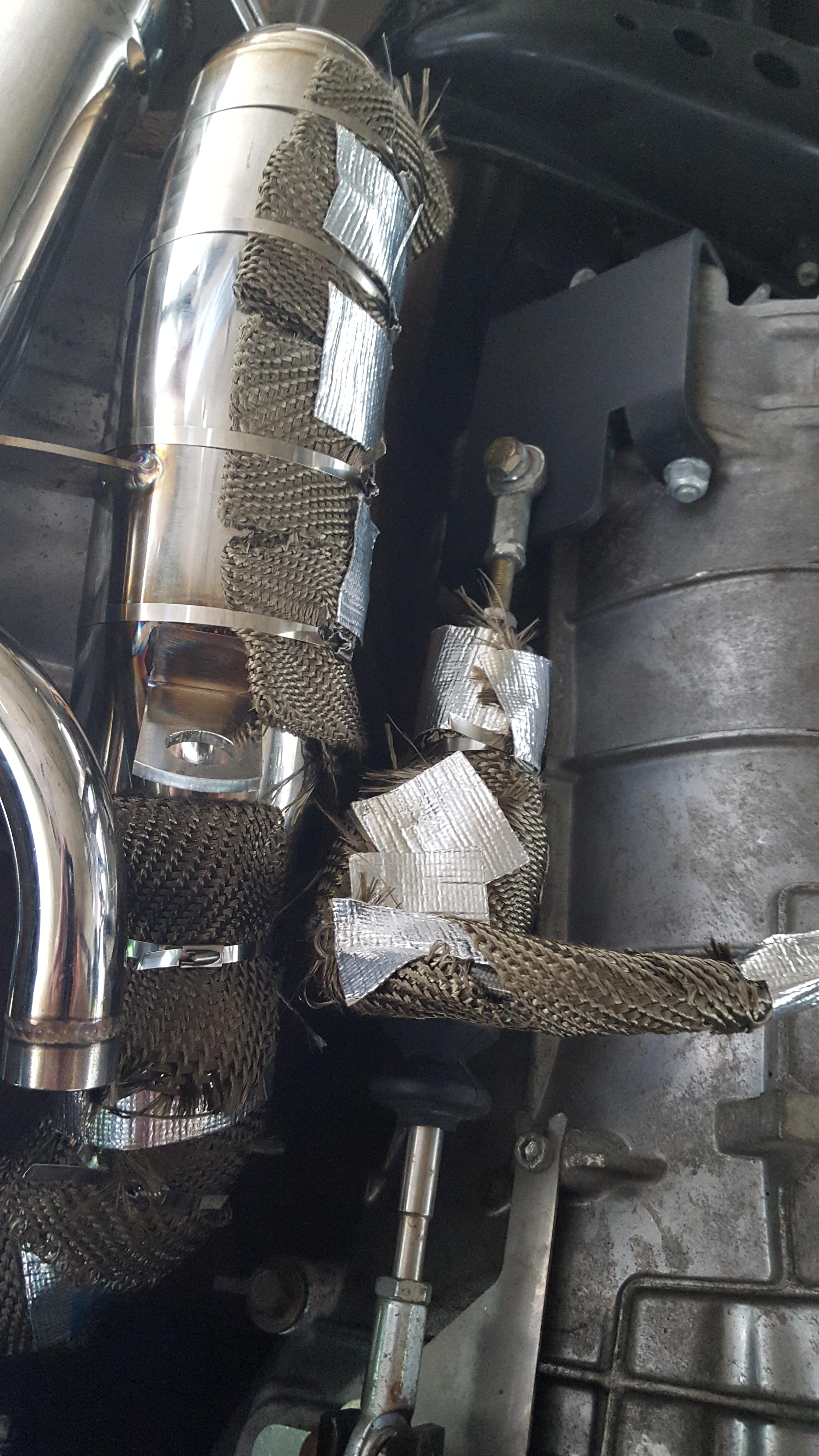 At the buyers request I can put back on the cooling solution (titanium exhaust wrap held on by metal zip ties). The reason I had these on the driver resonance chamber was I have an aftermarket slave clutch cylinder, so the resonance chamber got really, really close to it. The OEM cat obviously didn't. If you don't have an aftermarket CSC at this position, or you don't care, then nevermind.