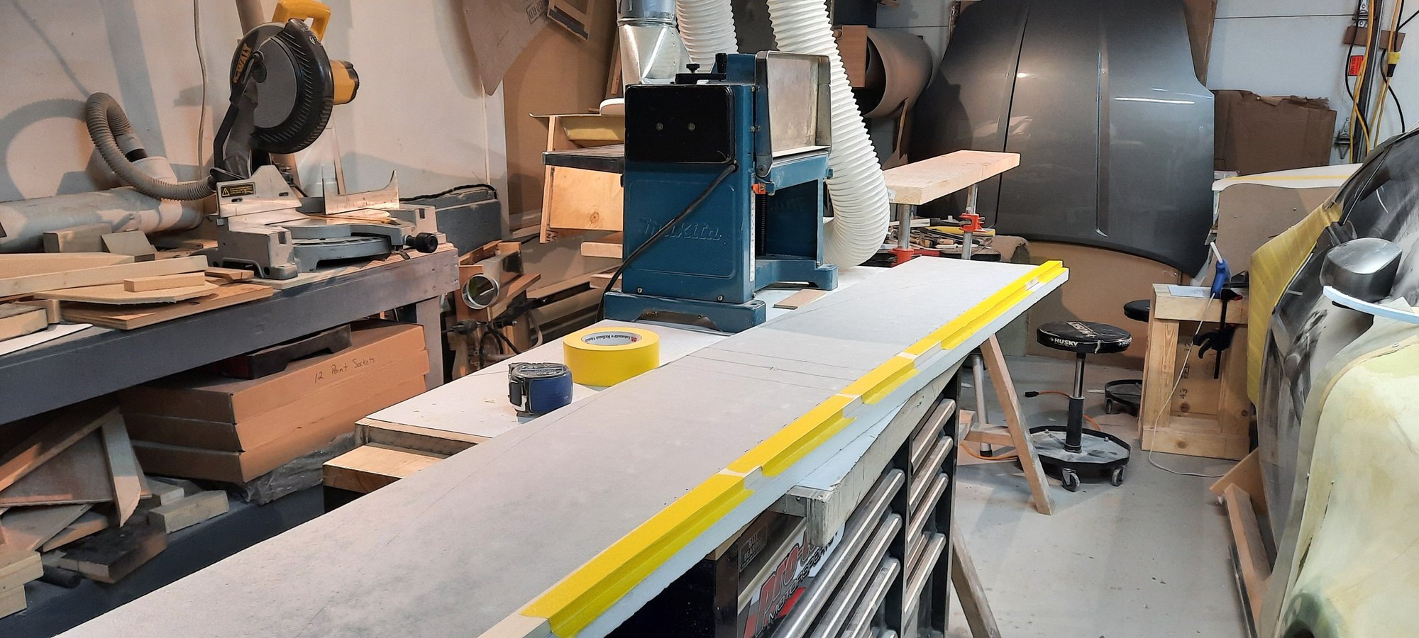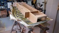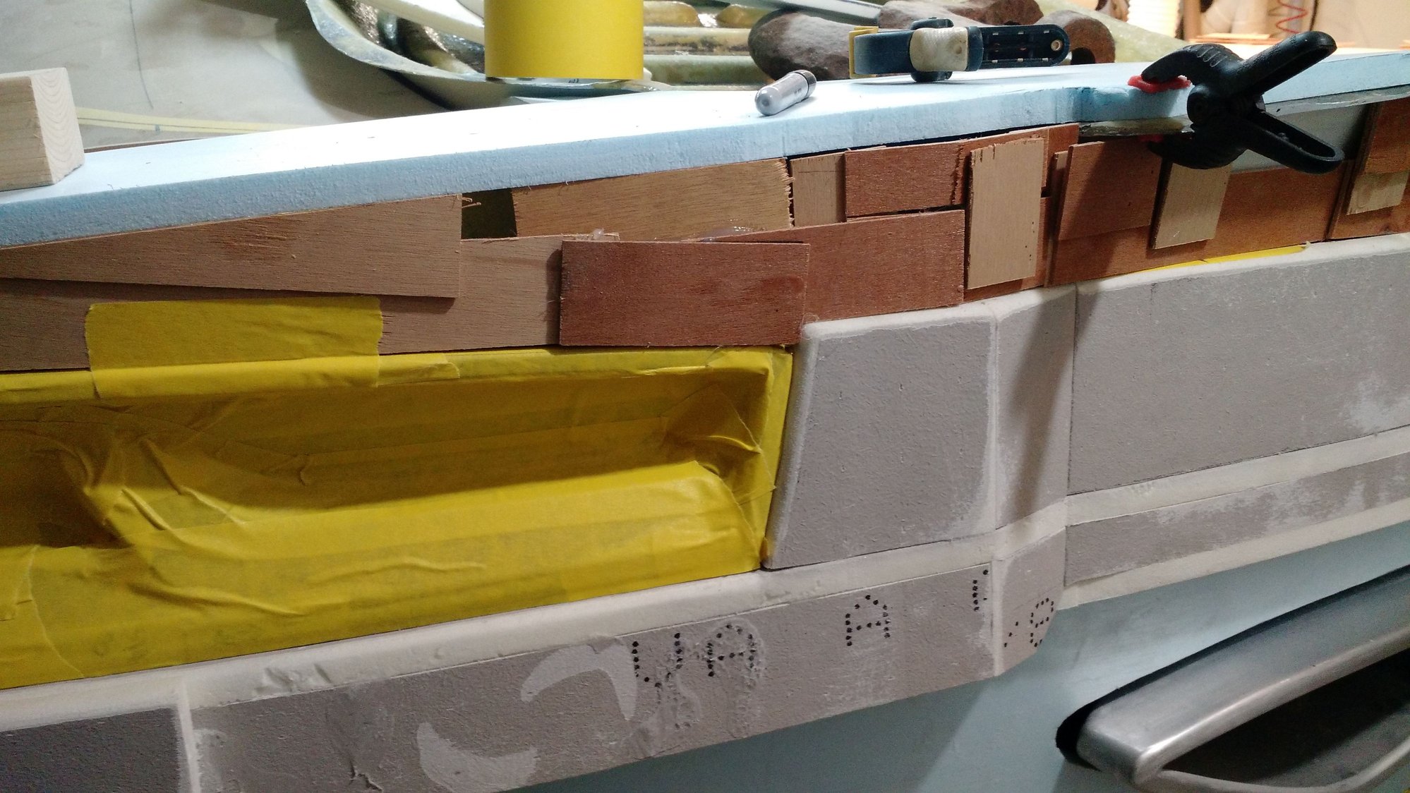 Time for an other update , still plugging away in the forest on the Falcata , we had a huge wind storm here on the Island last night , yes you guessed it power got knocked out again , seems like the only time I get to update is when the power gets knocked out at the shop in the forest . So I have been busy remaking all the pieces I had made in the blue foam with a few changes along the way . Here I taped a couple of strips of wood on the foam and ran it in the planer to make a taper , seemed to work out , these pieces are to make the big piece that goes across the back thicker and have a taper