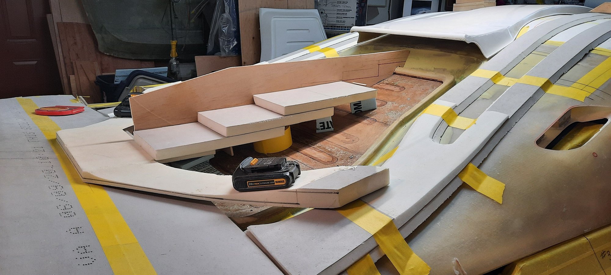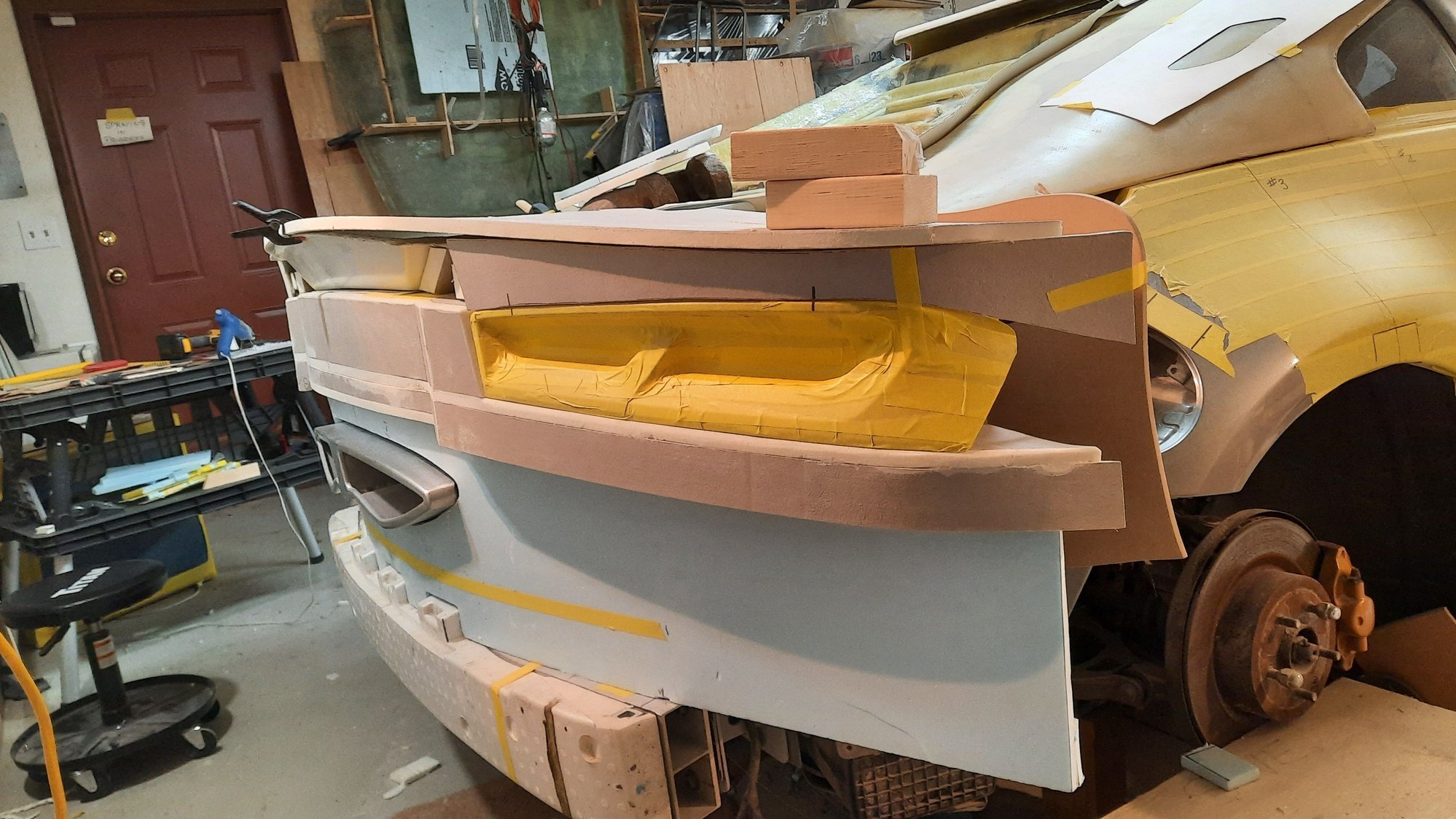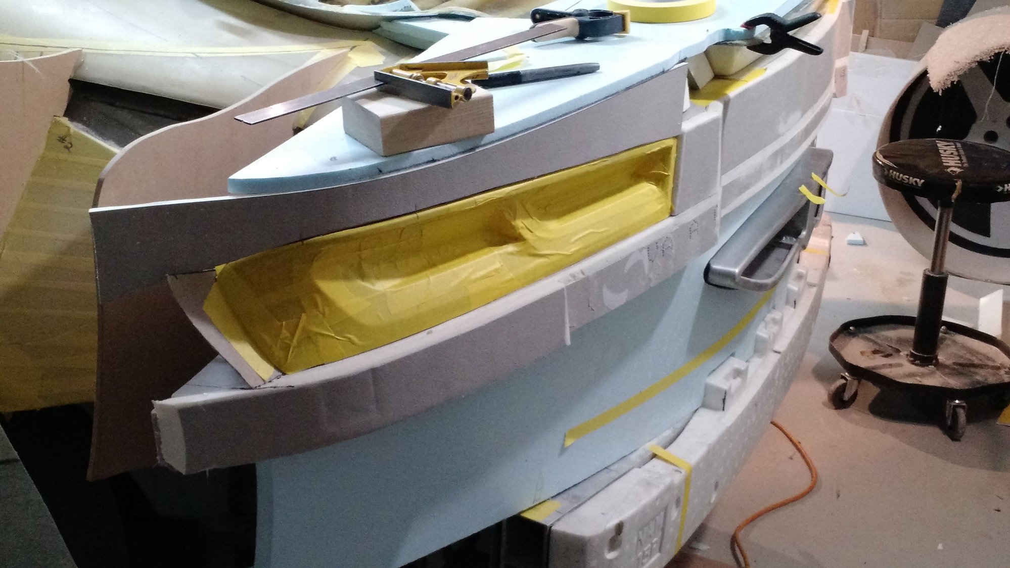 So in case there is any confusion with this , there are two parts here the lower one is like the hatch replacement , which seals the back of the car and the top part , which will be the outer cover ( body ). These two parts will be bonded together before they go on the car. Then the combined part will be bonded to the roof and bolted here where you see bolts , then a small flat piece will be bonded over to hide the bolts . This will be the pattern to cut the foam to make the upper edge in the router table cutting the foam in the router table these get hot glued on and then the inside gets filled with foam and shaped