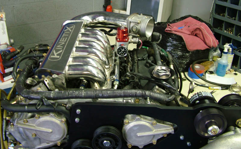 He didn't spend a lot of time on the car last friday because he was finishing up that elise, but did get a few things done prepping the car and engine. He got the fuel gauge for the fuel system mounted on and also got some of the vortech parts mounted on. He just placed the blower on the engine for now to help get the other parts in place. It'll be removed when the engine actually goes back in then put back on later.