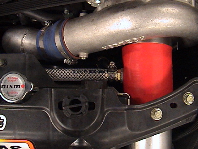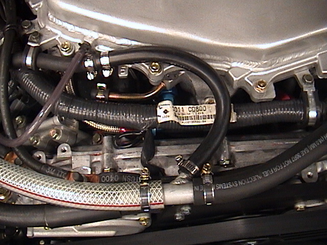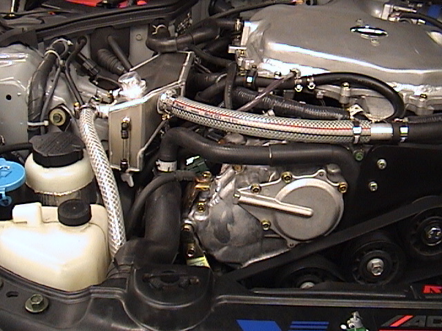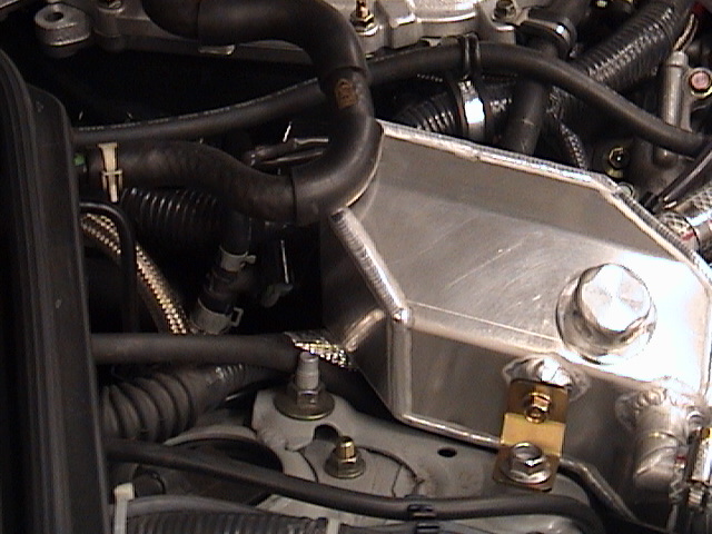 Here a few Pict's. of the ARC modified AAM oil catch can. The overall fit of the can is very nice, I don't have a strut brace so I don't know how it fits under it. I had to pull a few mods. because of the Vortech, like routing the right side valve cover vent line differently. I also added a 5/8" barbed port on the silicone charger intake, so the catch can will be under constant vacuum.