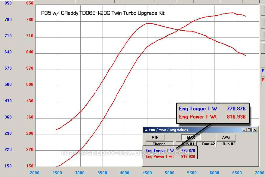 GReddy R35 TD06SH-20 Twin Turbo Upgrade Kit. Well we are happy to report an update. Over the weekend, they began to boost up a little more from their 706whp @ 1.45kg/cm2 to a crazy 816whp @ 1.7kg/cm2!