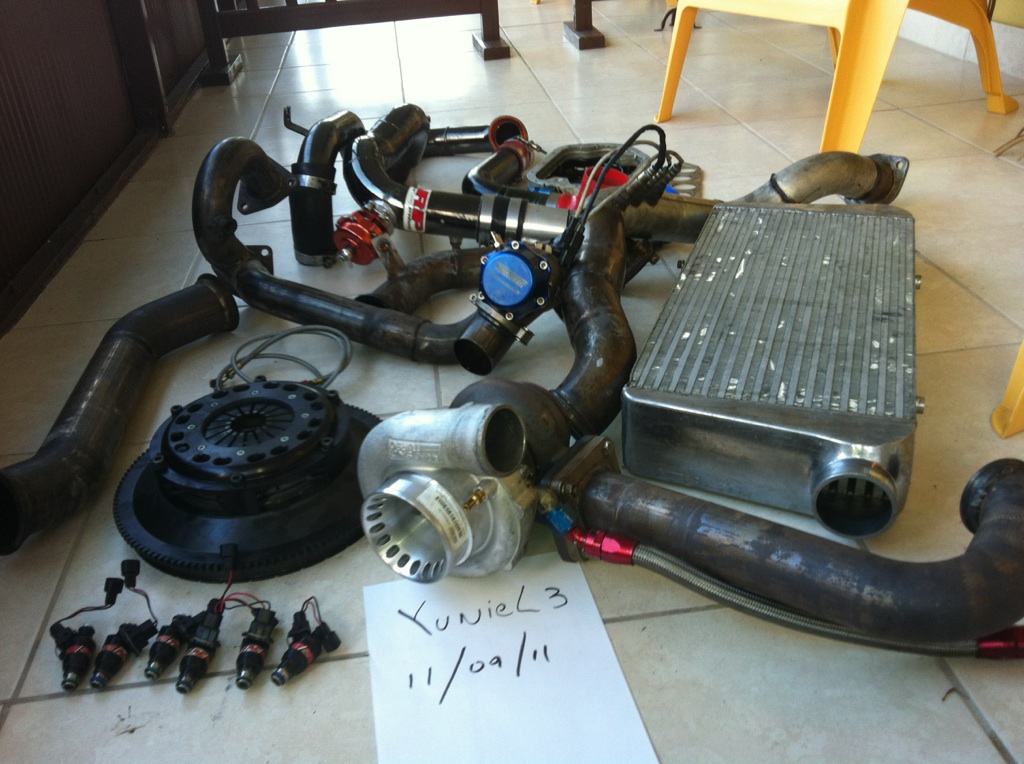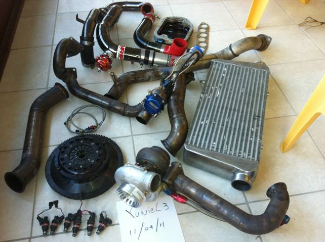 selling my single turbo KIT WITH a precision 67/66 in this turbo its BRAND NEW ONLY USED IT FOR 300 MILES! it comes with a 50mm turbosmart wastegate, tail 50mm BOV, intercooler ,all piping hose and clamps injectors 1000cc RC ,Walbro fuel pump 225, exhuast pipe all the way to the back and muffler and engine spacer for return oil from turbo,turbo heat shild, turbo is new under warranty ,competicion twin disck clutch good for 650lbs torque it has bout 2500miles this car was not my daily drive, its a costum made kit, made out of stainless steal pipes for better flow are bigger pipe size than turbonetic kit, its perfect kit to start and to make 850whp+ sorry i forgot to take picture of turbo heat shild, fuel pump and muffler,its a single exhaust system. i made 609whp with this set up it was was amazing it cost me $8500 built from scratch.