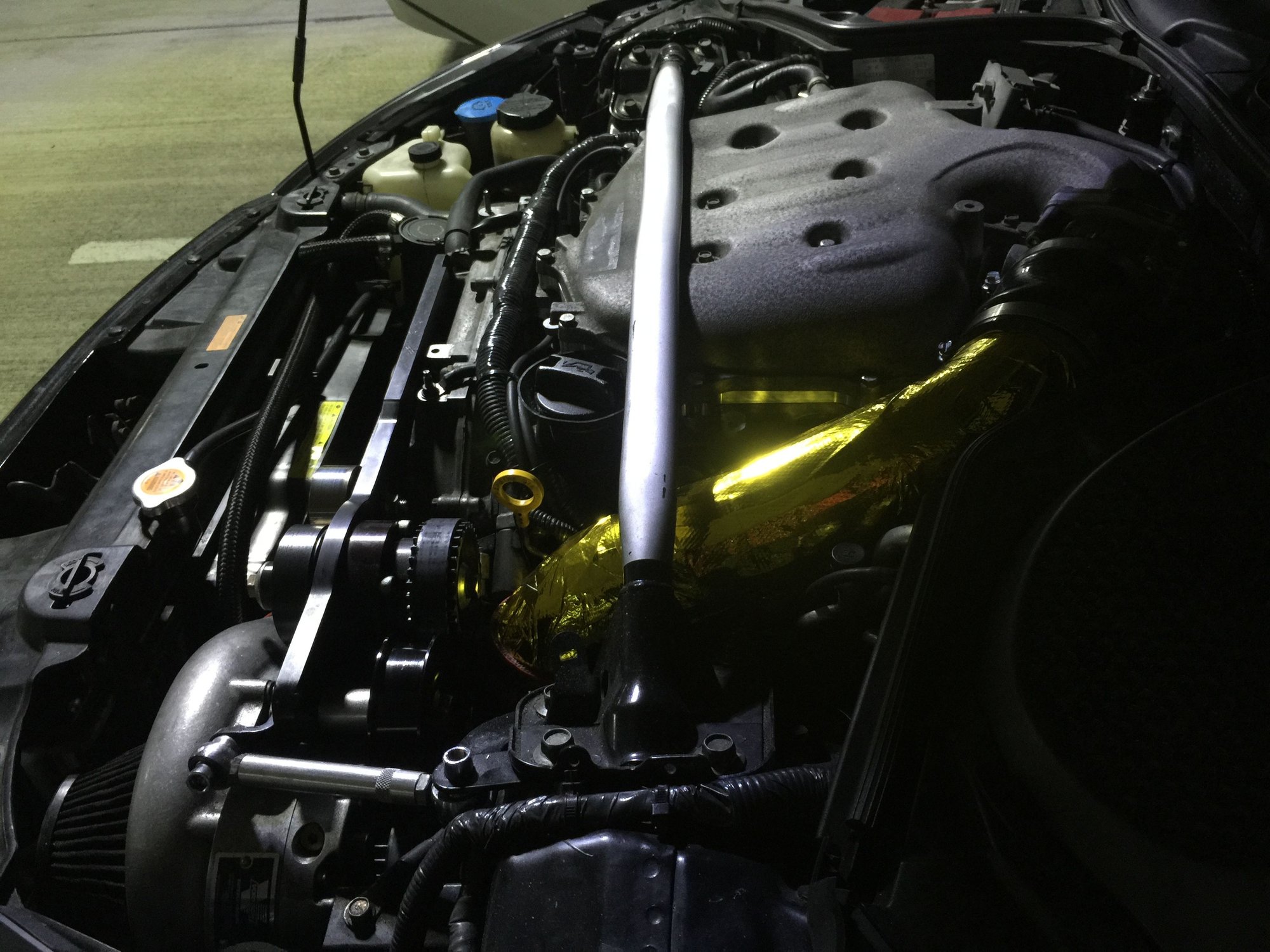 - Mishimoto J-Line intercooler (improved fin density and cooling capacity over the intercooler provided with the Vortech system. Intercooler piping has been modified to fit the Mishimoto intercooler perfectly.)