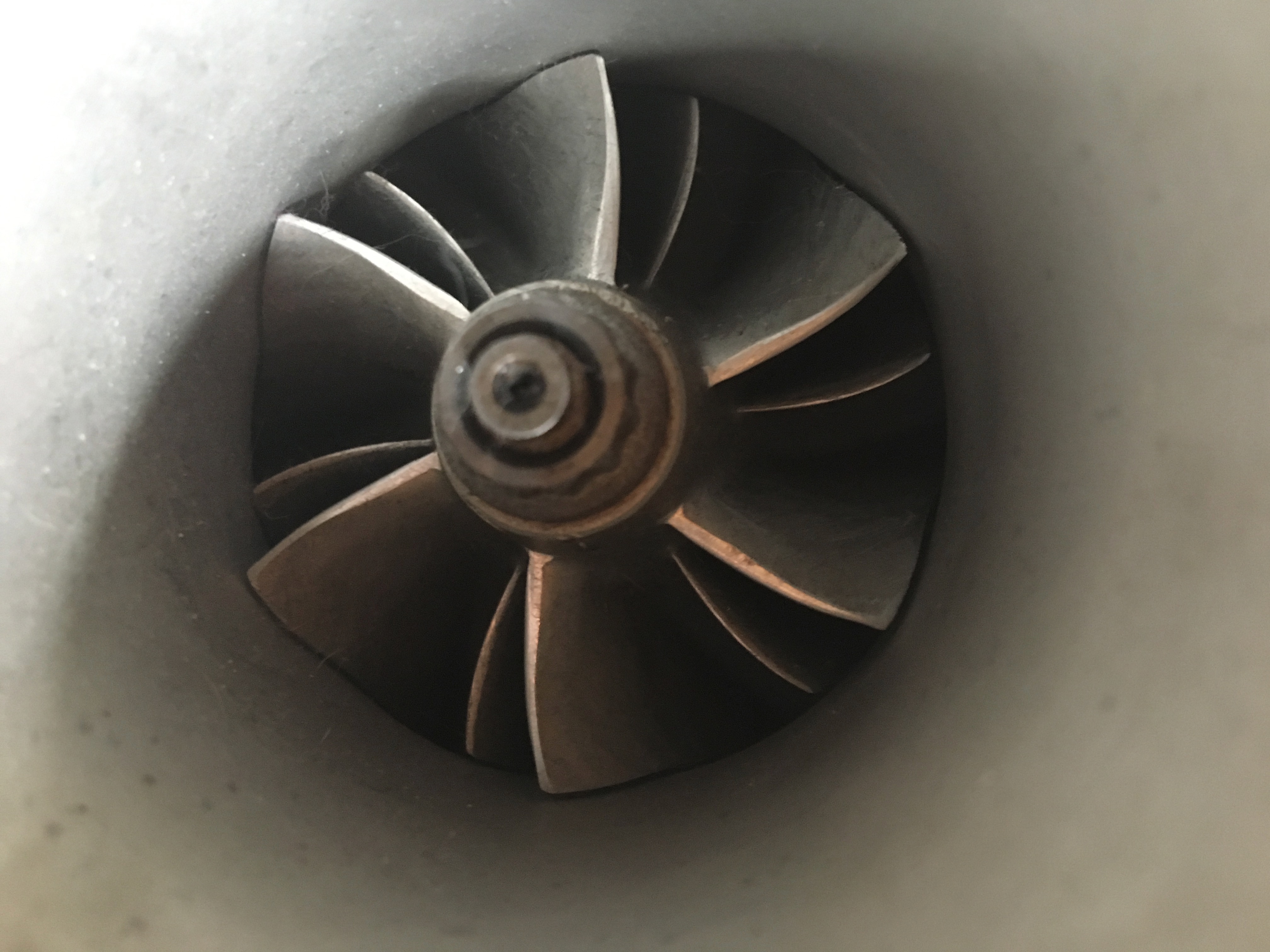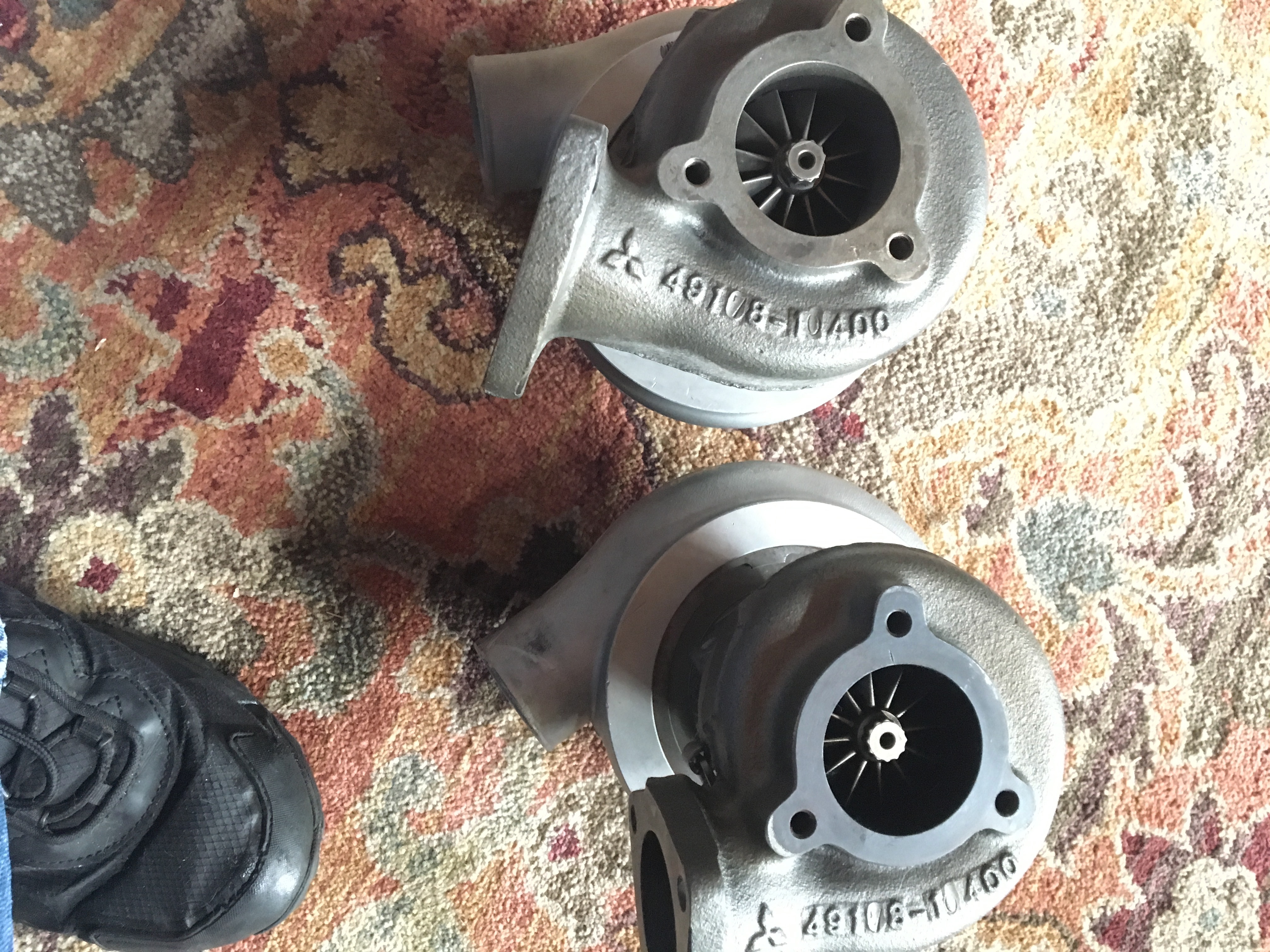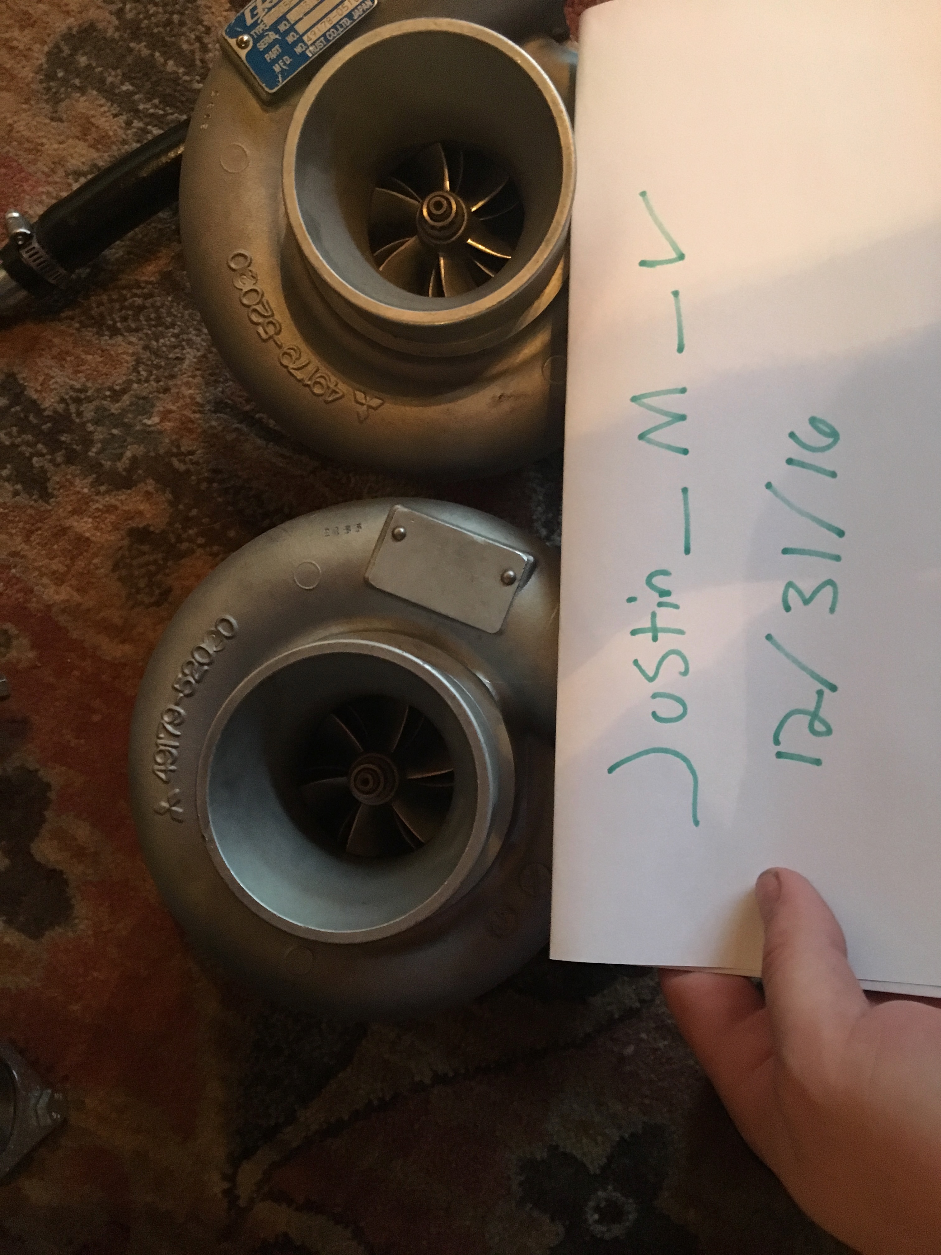 The kit comes complete except for one charge pipe that I was planning on fabricating when I installed it. The turbos have no shaft play, blade chips or scoring.