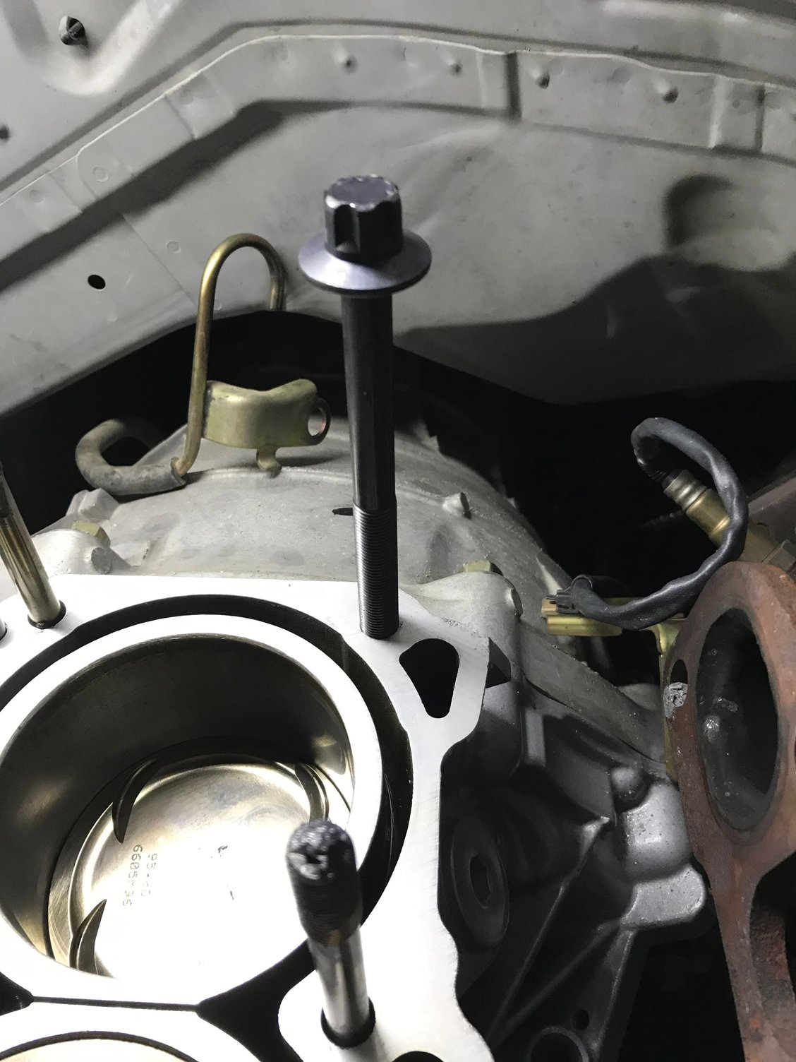 Reassembled the head today went to install it went through the 3 step tightening process (30,60,90) got to the last bolt on the final torque setting and it went righty tighty to righty no tighty striped some threads in the block, when I realized what had happened I took a closer look and the stud was backed out about 1/2” probably happened when I took the head off and since it was all the way in the back I didn’t notice it when I put the head on. There are still threads further down. And the stud was a pain getting out, it didn’t want to turn. ended up striping the 3/16 hex in the stud. Had to use 2 nuts like jam nuts in order to get the stud out. Luckily I can get individual studs for around $40 the question is what to do about the block