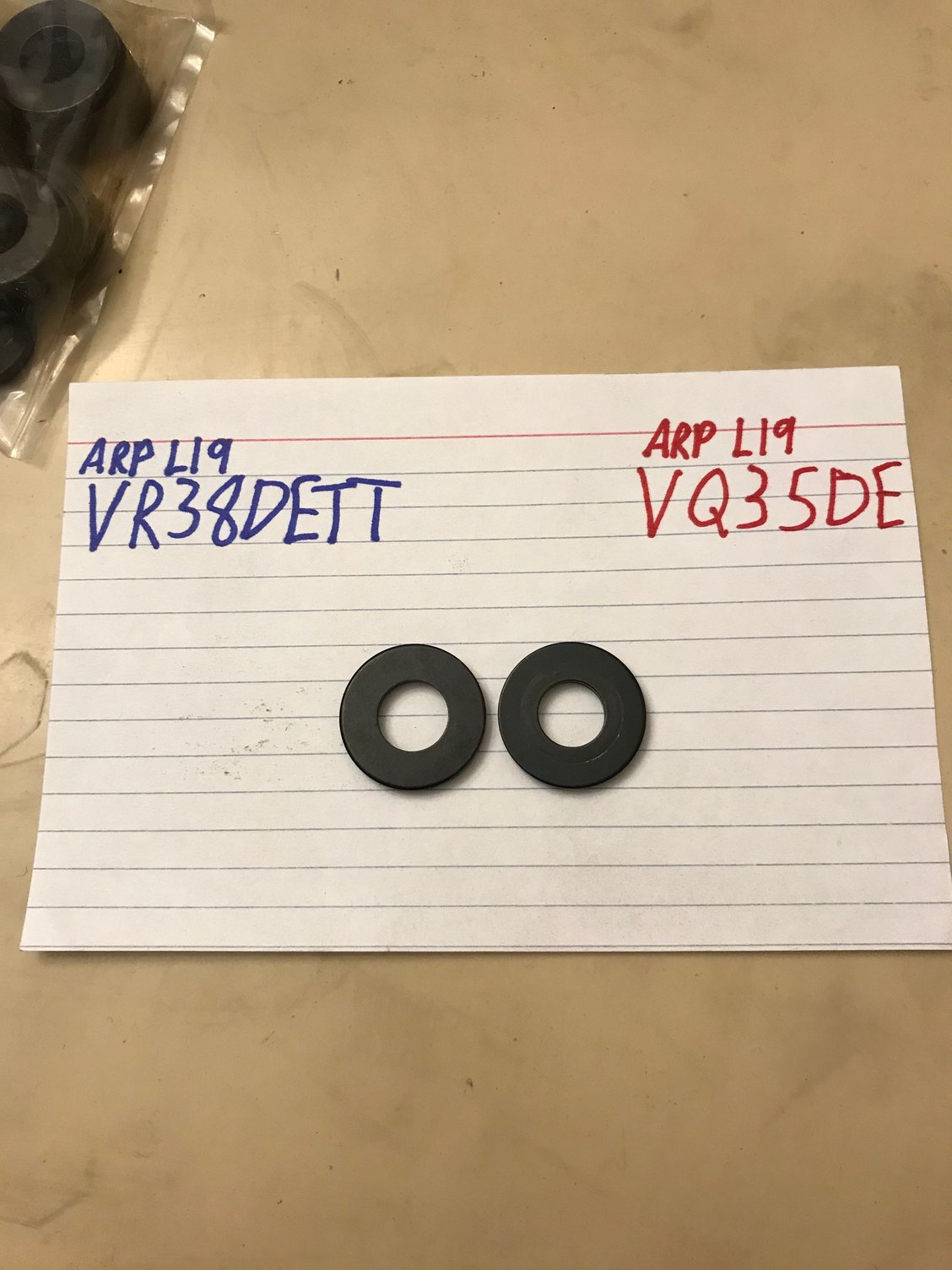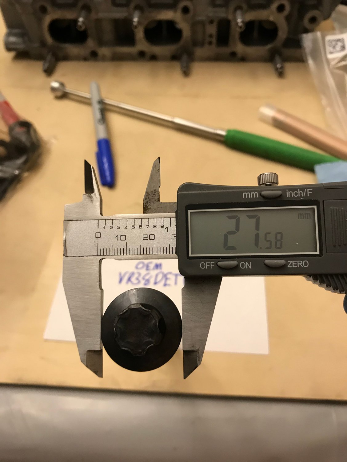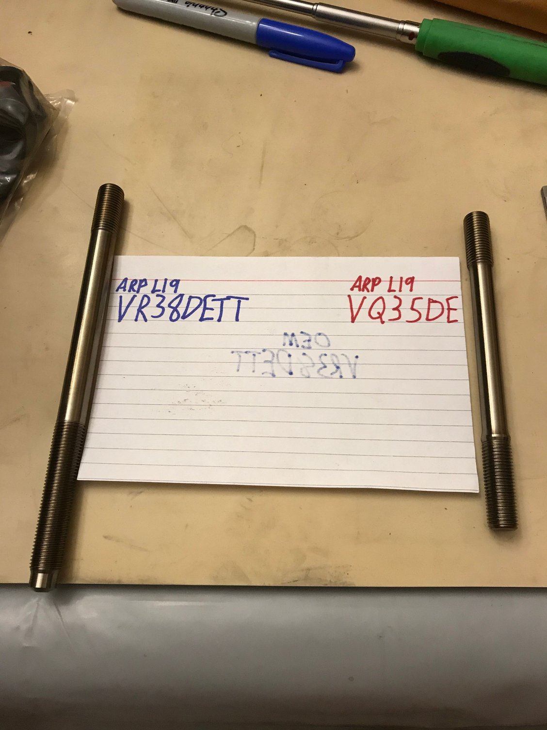 Ok it’s been a hot minute since I updated this and I’ve got some juicy stuff for all you high hp guys, the VR38DETT ARP L19 studs came in. To start off with I took some initial dimensional information as a comparison to the VQ35DE ARP L19 studs To start off here side by side visual comparison of the washers used in each kit Their outside diameter is basically the same and the washers from the GTR kit will fit in the machined holes in the VQ35DE cylinder head no problem Obviously the GTR stud is larger and so then is the washer inside diameter Washer from GTR L19 kit in place in the VQ35DE cylinder head, and you might be wondering why I would even check? And the answer is that the OEM GTR head bolt had a larger flanged neck which does not fit into the little machines spots in the head without flushing the surrounding area with the bolt surface. Also there is a little interference with the actual cylinder head casting that holds the lifter buckets that you would have to grind down if you decided to use them I happened to have a few unused GTR studs so Here is the head measurement and as you can see it’s only a few mm larger but because of how long the bolt is and how large the bolt head diameter is if you don’t mill out a little bit of the casting for the lifter guide around the bolt hole you won’t even be able to insert the bolt all the way Side by side comparison of the VR38DETT and VQ35DE studs Compared the the VQ stud with the 3/16 Allen key The GTR stud hex is slightly larger and a 5mm Allen key is perfect for easy installation The GTR stud threads are longer than the VQ stud threads. This is the portion that threads into the block. the length of the GTR stud is significantly longer than the VQ stud, so at least the holes for the 2 front and 2 rear bolts for each head need to drilled 2-3mm deeper into the block to clear the camshafts and the holes must be threaded all the way to the bottom Side by side comparison of the VQ35DE L19,VR38DETT L19, and OEM GTR bolt