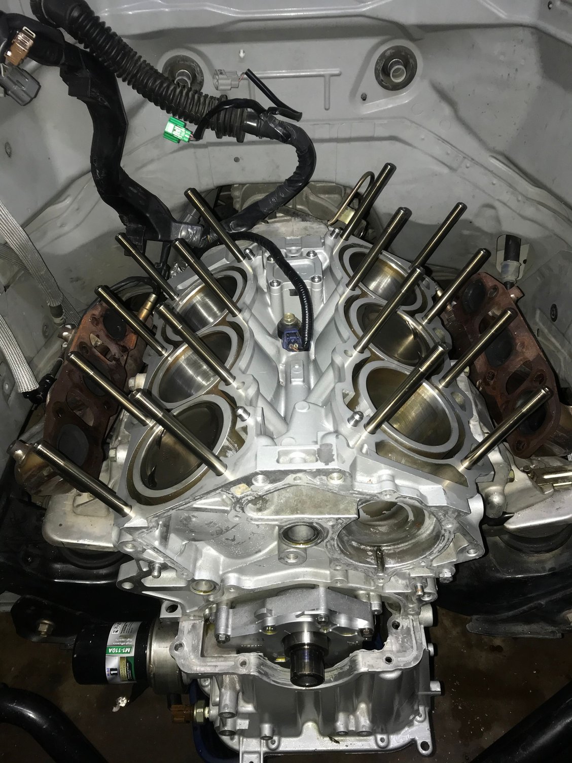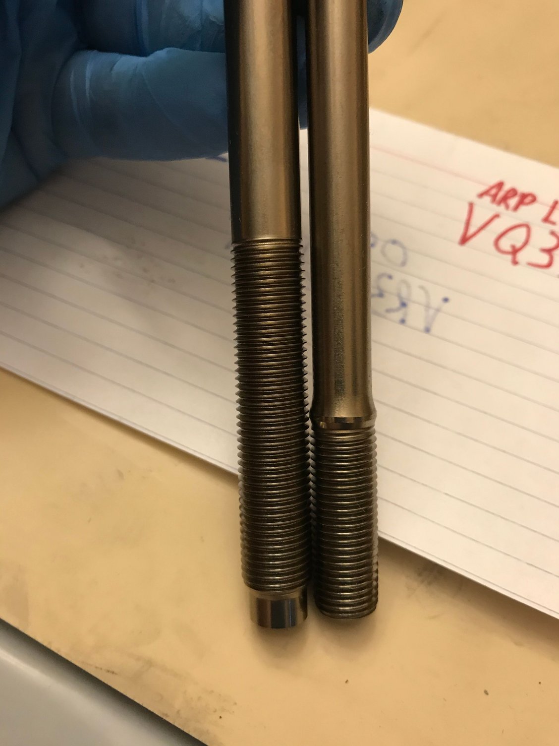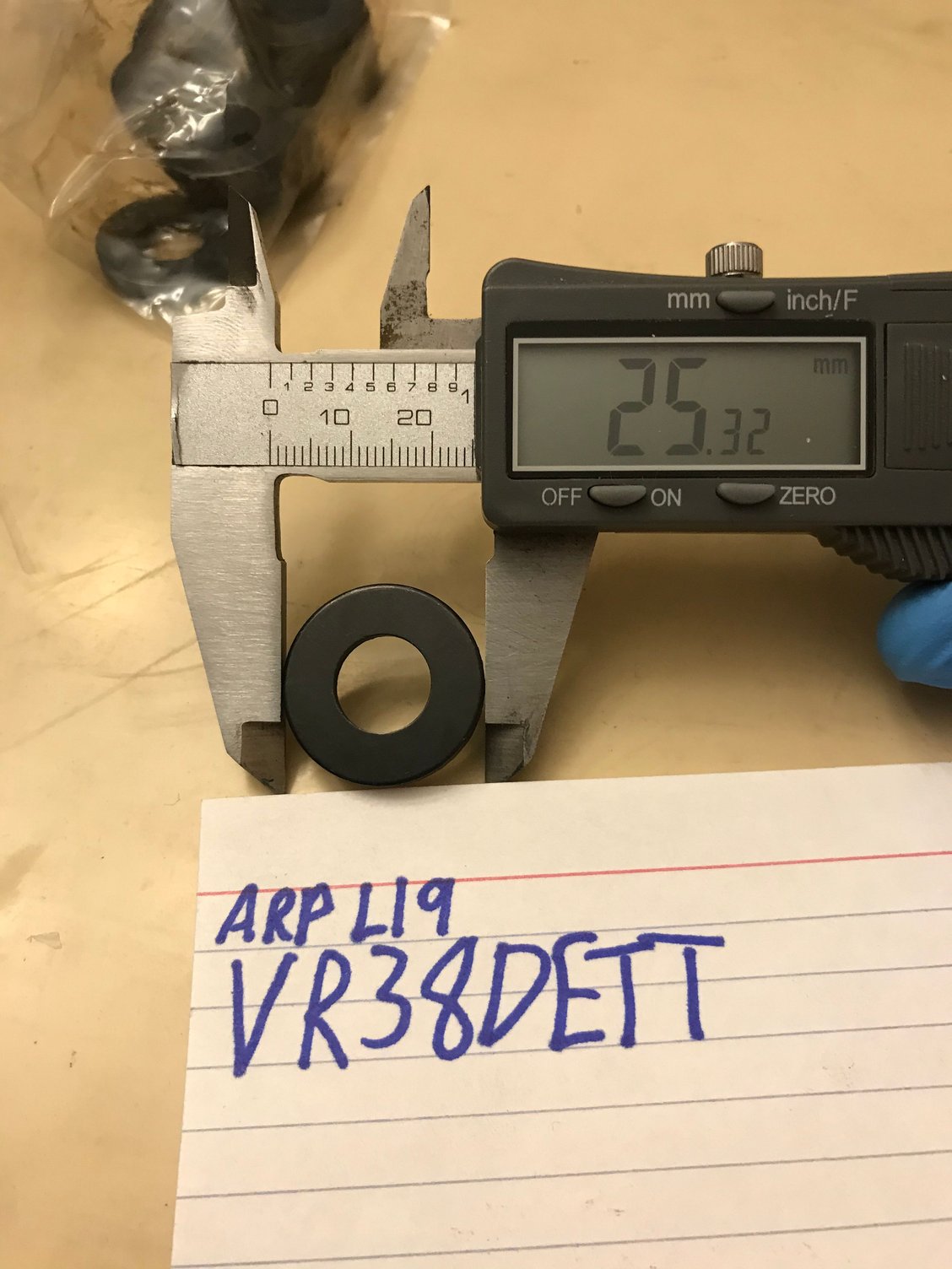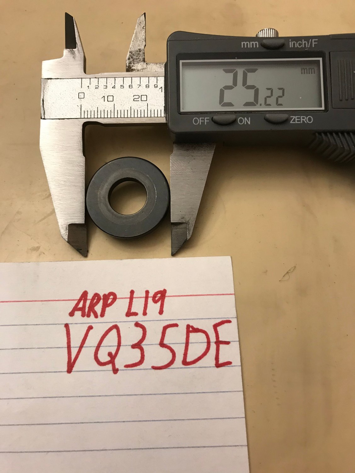 Ok it’s been a hot minute since I updated this and I’ve got some juicy stuff for all you high hp guys, the VR38DETT ARP L19 studs came in. To start off with I took some initial dimensional information as a comparison to the VQ35DE ARP L19 studs To start off here side by side visual comparison of the washers used in each kit Their outside diameter is basically the same and the washers from the GTR kit will fit in the machined holes in the VQ35DE cylinder head no problem Obviously the GTR stud is larger and so then is the washer inside diameter Washer from GTR L19 kit in place in the VQ35DE cylinder head, and you might be wondering why I would even check? And the answer is that the OEM GTR head bolt had a larger flanged neck which does not fit into the little machines spots in the head without flushing the surrounding area with the bolt surface. Also there is a little interference with the actual cylinder head casting that holds the lifter buckets that you would have to grind down if you decided to use them I happened to have a few unused GTR studs so Here is the head measurement and as you can see it’s only a few mm larger but because of how long the bolt is and how large the bolt head diameter is if you don’t mill out a little bit of the casting for the lifter guide around the bolt hole you won’t even be able to insert the bolt all the way Side by side comparison of the VR38DETT and VQ35DE studs Compared the the VQ stud with the 3/16 Allen key The GTR stud hex is slightly larger and a 5mm Allen key is perfect for easy installation The GTR stud threads are longer than the VQ stud threads. This is the portion that threads into the block. the length of the GTR stud is significantly longer than the VQ stud, so at least the holes for the 2 front and 2 rear bolts for each head need to drilled 2-3mm deeper into the block to clear the camshafts and the holes must be threaded all the way to the bottom Side by side comparison of the VQ35DE L19,VR38DETT L19, and OEM GTR bolt