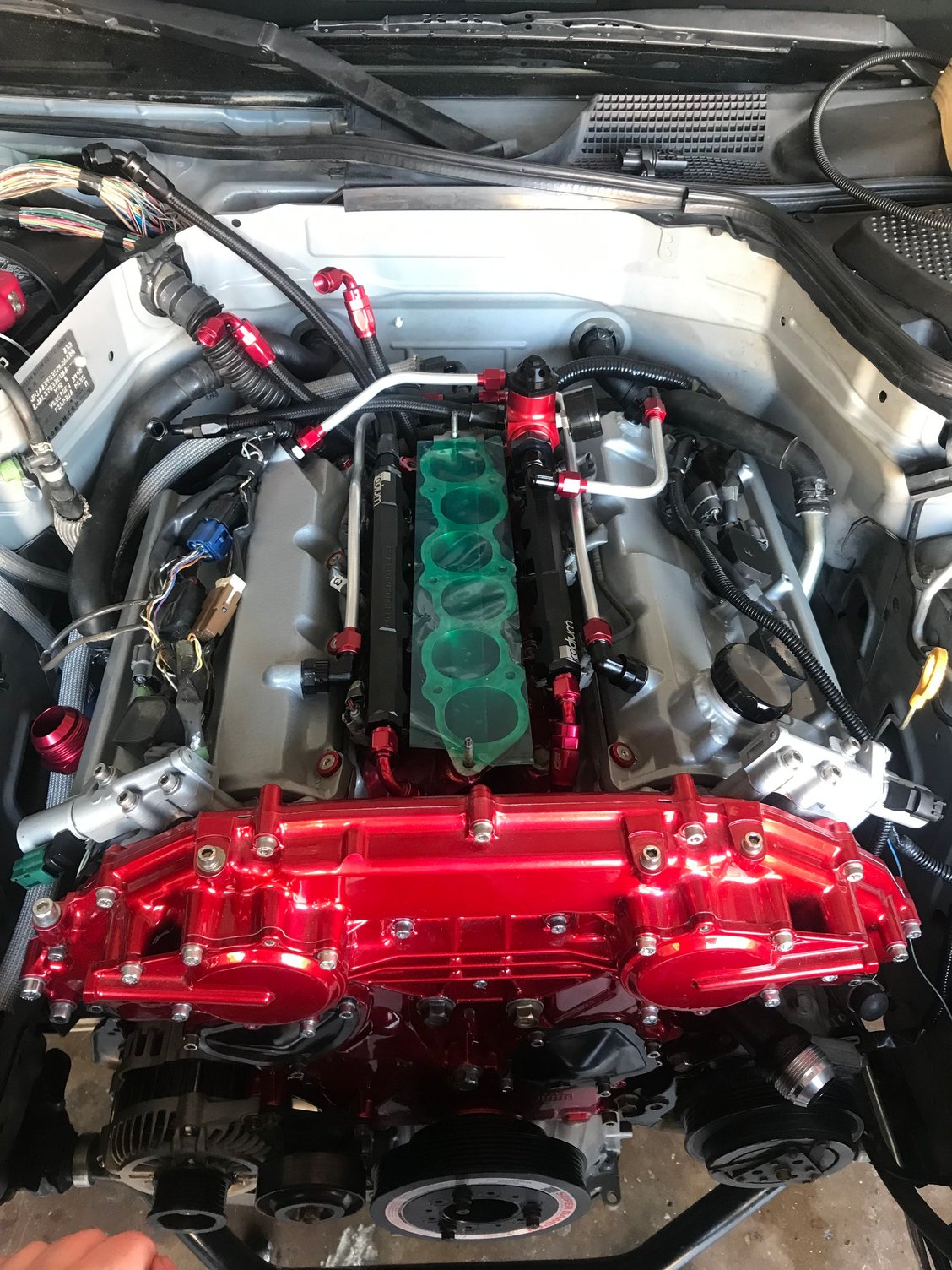 Small update, car is 95% reassembled with the remaining 5% being interior related. Started her up this morning, after a somewhat hesitant crank she started first try which is a first for any of my project up till now 😂 I moved her from the garage to the driveway under her own power so I could tidy up the garage. I am having an issue with the drivers side fuel level sender which thinks the tank is empty at half tank, I will probably have to replace it as I think I might have scratched the level contacts, I also ordered a chase bays coolant reservoir and a oil catch can for the outlet of the exa pump they will go in with the oil cooler once I finish the tune and engine brake in. As for tuning I’ll be focusing on regular fuel instead of high octane, there is just no need or benefit from it with the 8.8:1 static compression, of course when the turbo goes on that’s a different story and I’ll switch back to high octane. I forgot to take pictures of it but I designed and printed a firewall plate to slide into the slot by the battery to cleanly secure the 0/0 gauge power and ground alternator wires and the fuel signal line that goes from the regulator to the fuel pressure sensor, I plan to do the same for the now empty wire grommets on both sides of the engine bay that the wires for the headlight, horn, washer res, all passed through, since I relocated those wires out of sight the grommets are empty and don’t look good. The large bundle of wire from the main harness tuck fits snugly behind the beauty panel between the engine and fire wall there is just enough room under the ac lines for it all to fit