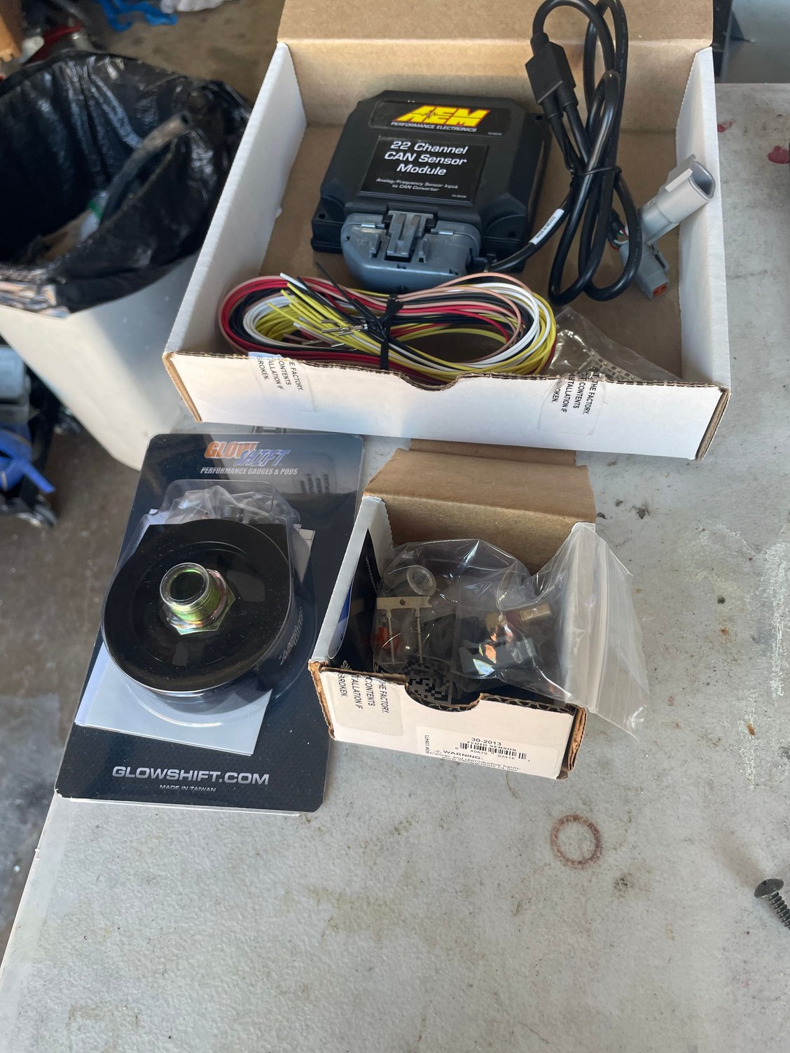 Well it’s been awhile since I posted here, been enjoying the car as it for the last several weeks, in that time I’ve been planing out what I need for the next phase of the project. Right now I’m running bare minimum electronics and that makes the tuning process very slow as I basically rely on uprev for all my data. I decided I wanted to completely change my the dash setup. So the new plan is as follows 1) I’m replacing the dash cubby with a 7” digital display 2) replacing the oem triple gauge pod with AEM x series gauges specifically GPS speedometer, Truboost, Wideband 3) I’m installing AEM’s 22 channel can bus interface 4) install a sub fuse and relay panel with a circuit breaker for quick power disabling for when I need to work on something 5) instead of running the AEM fuel and oil pressure gauges I already purchased, I’m going to just use the sensors with the digital display, additionally I also purchased an AEM oil temp sensor and a oil adaptor for the sensors 6) I’m building a breakout harness for new and future sensors and solenoid I’ll need for the turbo setup 7) since I will already have the interior torn apart for this I’m going to go ahead and redo my stereo and prep wiring for the eventual modified fuel surge setup