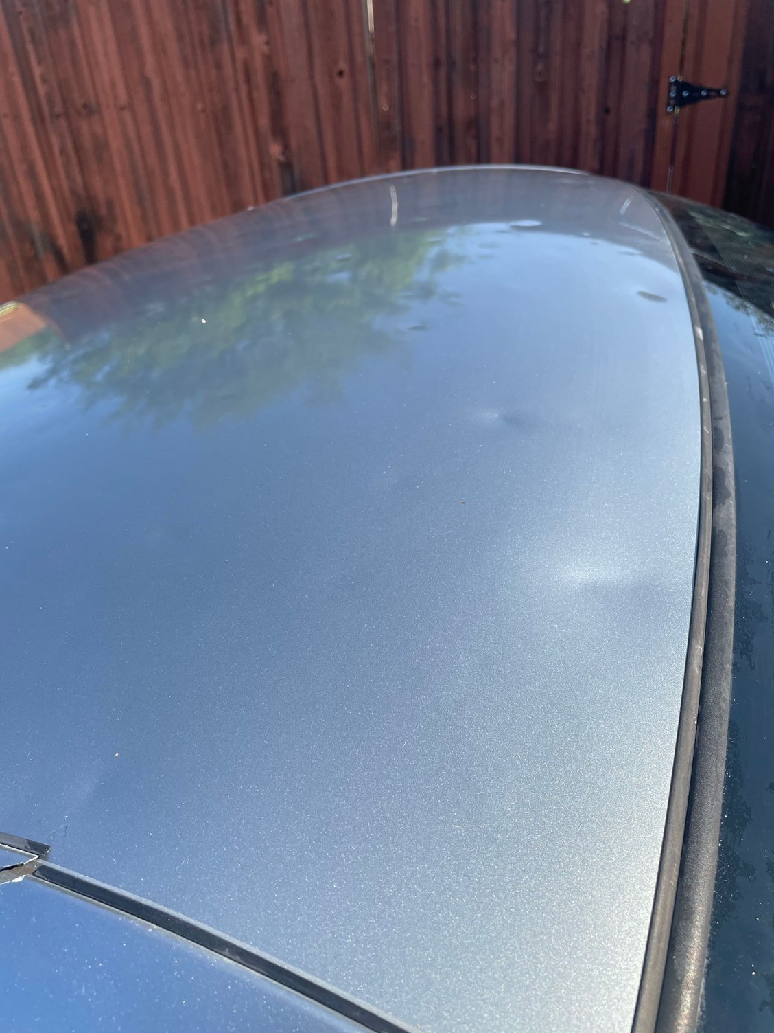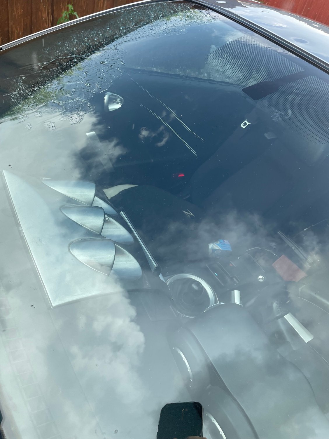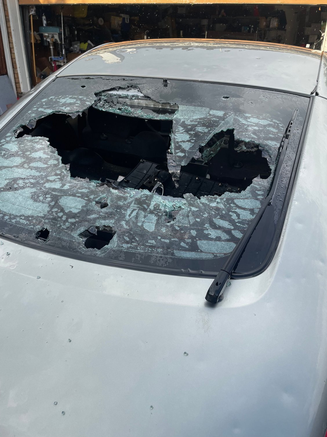 Every panel has dents, tail lights are trashed front windshield is cracked, rear window is completely smashed, paint on the mirrors has spider cracked, both a pillars are cracked badly and a good bit of water made it’s way into the car with the rear window smashed and don’t even get me started on the hood, yeah insurance totaled it…
