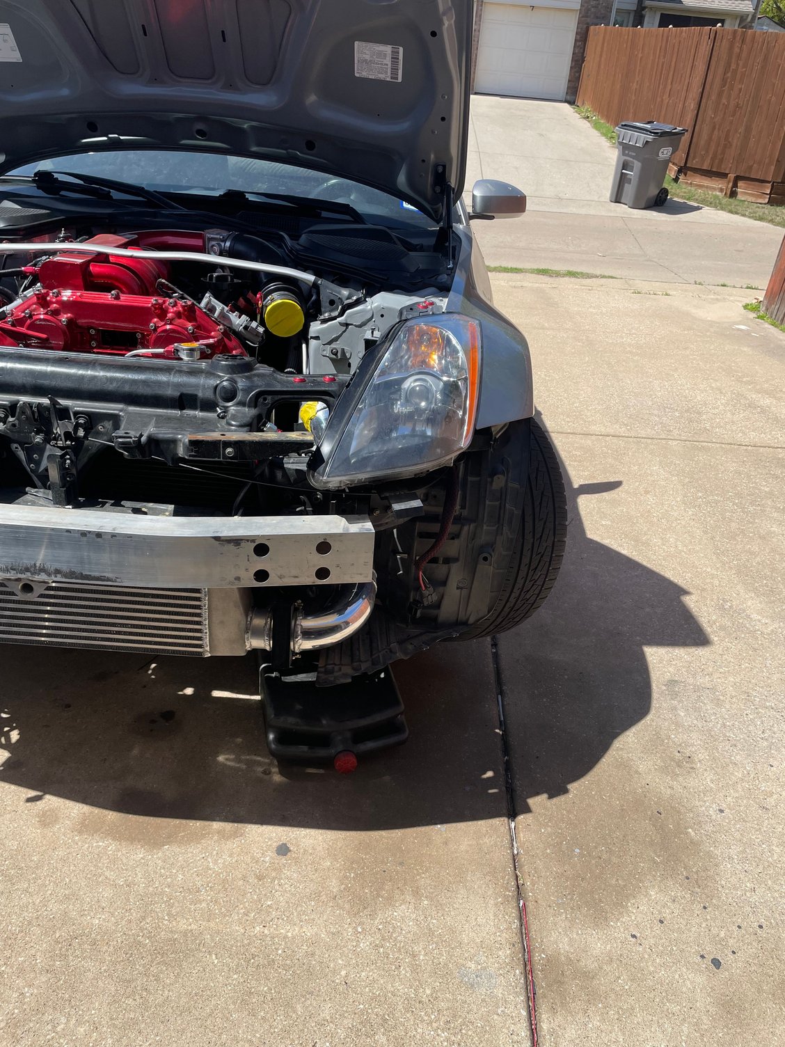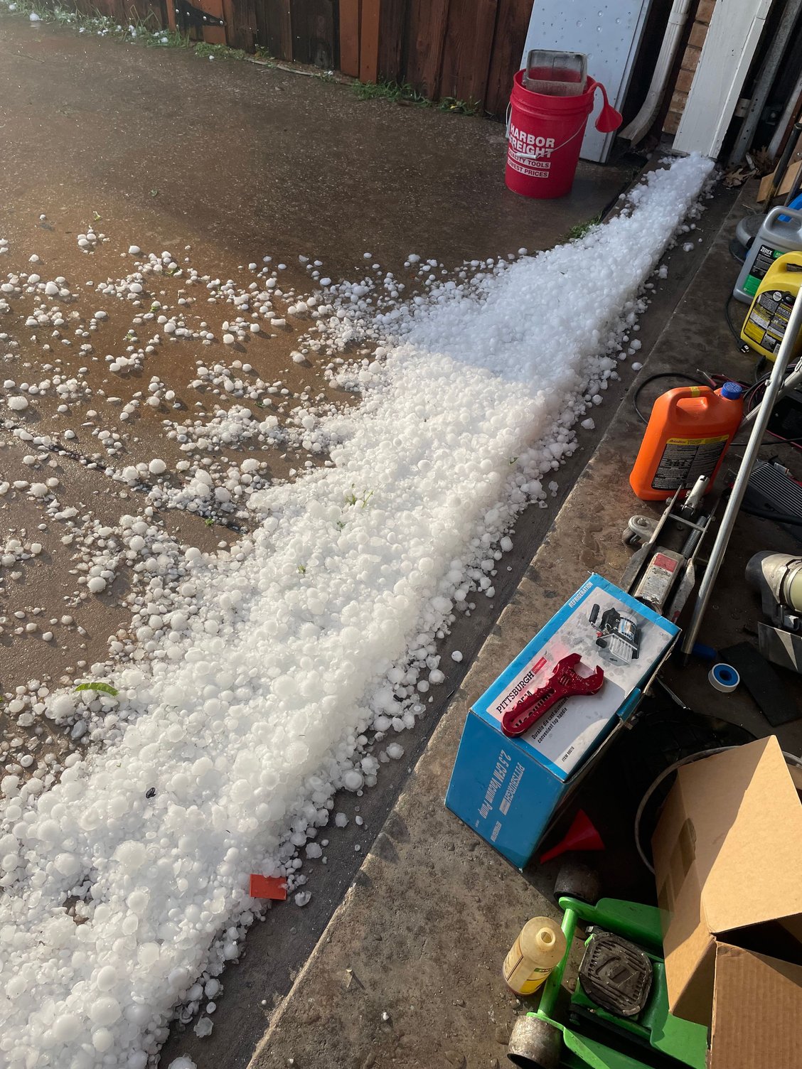 this is about where **** hit the fan in the worst way, while getting the turbo setup fabed out I had the Z on jack stands in the driveway as the garage was packed and it was easier to fab this way. In hindsight this was a mistake, for those who don’t know I live in Texas, the weather this spring has been quite crazy even for Texas. Well at about the end of May we got a very large hail storm… The storm came in quick and much more severe than forecasted, by the time I realized how bad it was going to get it was already hailing to bad to venture outside to try and cover the Z