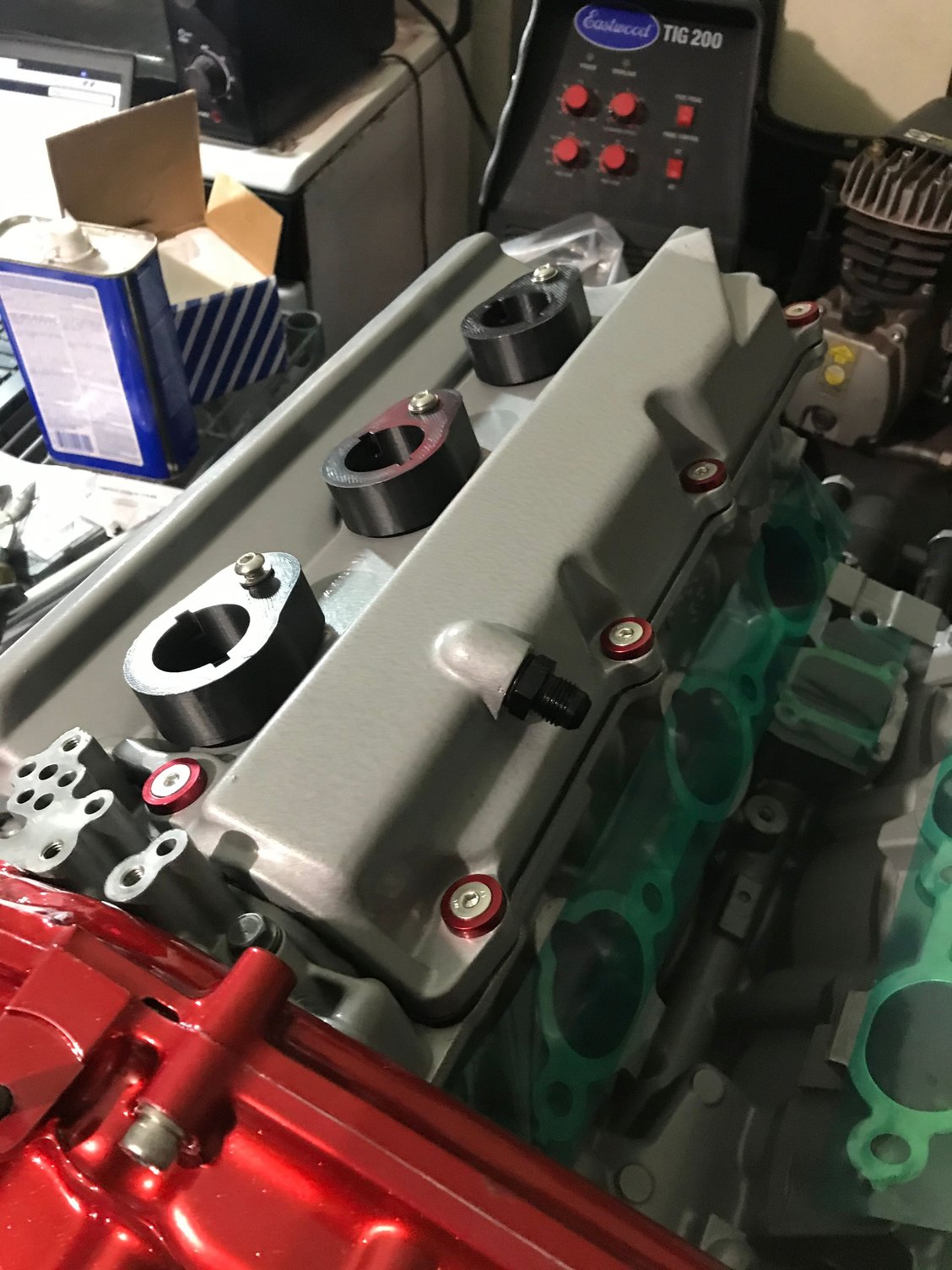 valve covers are done, I really didn’t like the look of the pathfinder plastic oil fill tube so I ditched it and welded a bung right to the cover. the new tube seals are installed and I painted it to match the block and cylinder heads