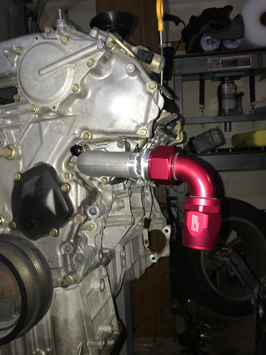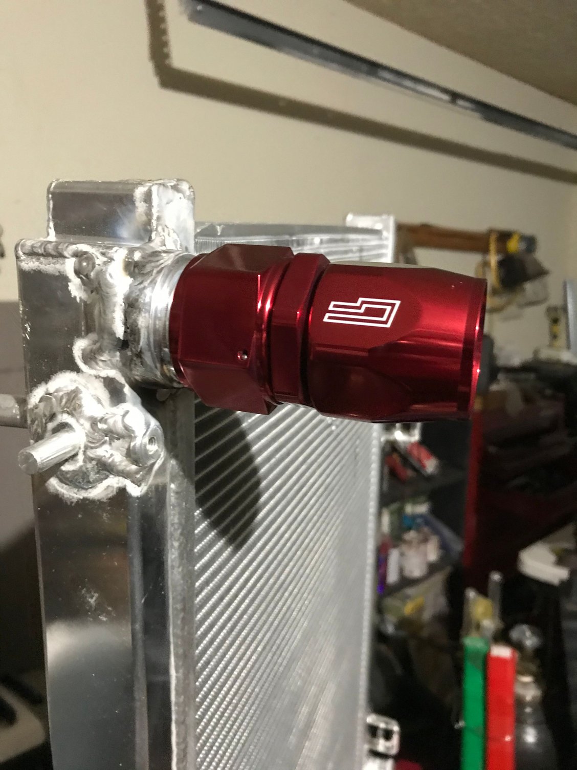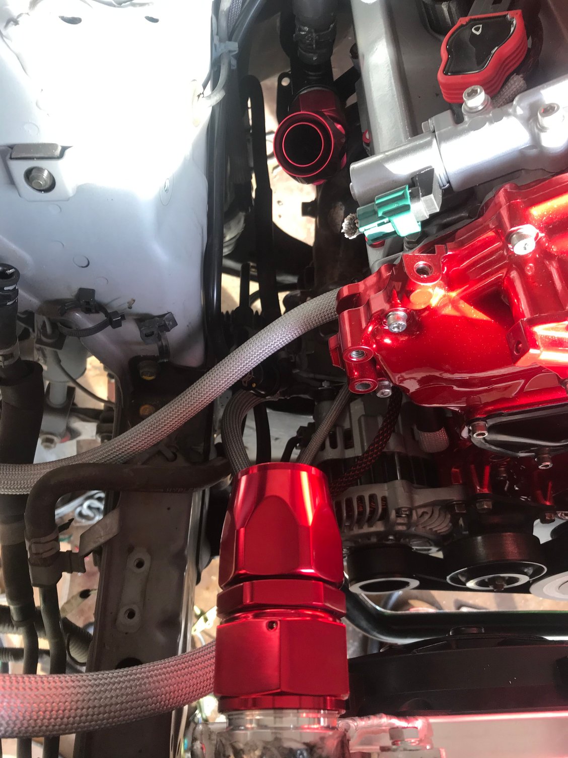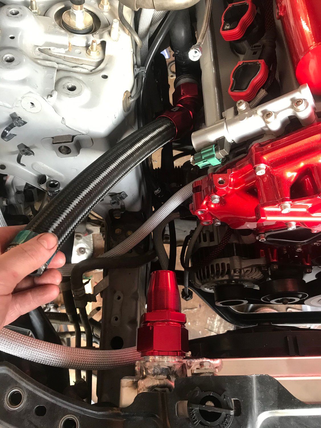 I chose anodized fittings that matched the powder coat for the front fuel rail lines Feed and return of the FPR Test fitting for clearance Throttle just nearly fits over the valve cover fittings FTW Disassembly of the thermostat before welding -20 fitting welded Powder coated black Also powder coated black I added an extra support bracket to the pipe to support it as the AN is significantly more rigid than the oem line and I had to cut the oem block mount off Testing the crank evac system, the exa pump maxed out at about 23inhg of vacuum but I don’t plan to run it that high, here I have the Vacuum regulator set to it’s lowest setting and I’ll keep it here for now. If I decide I need more later I can always turn it up but I don’t really want or need too much Manifold is on for keeps now Welded the bungs to the aluminum radiator Starting assembling the front end, I won’t fully reassemble it until the engine is running but I needed the radiator mount in place to assemble the radiator lines before the test start How she sits heading into the weekend, on a side note with the aluminum radiator and the shallow mount fan shroud I have more room in between the engine and radiator than before and it serves to show off the timing cover nicely