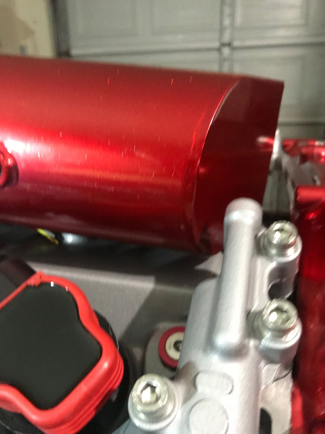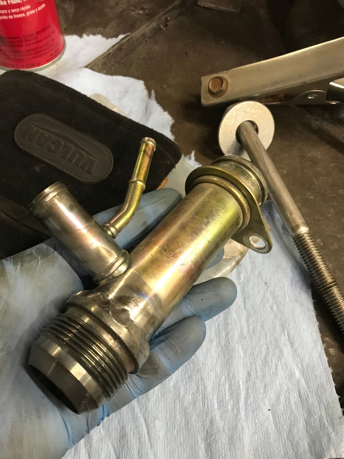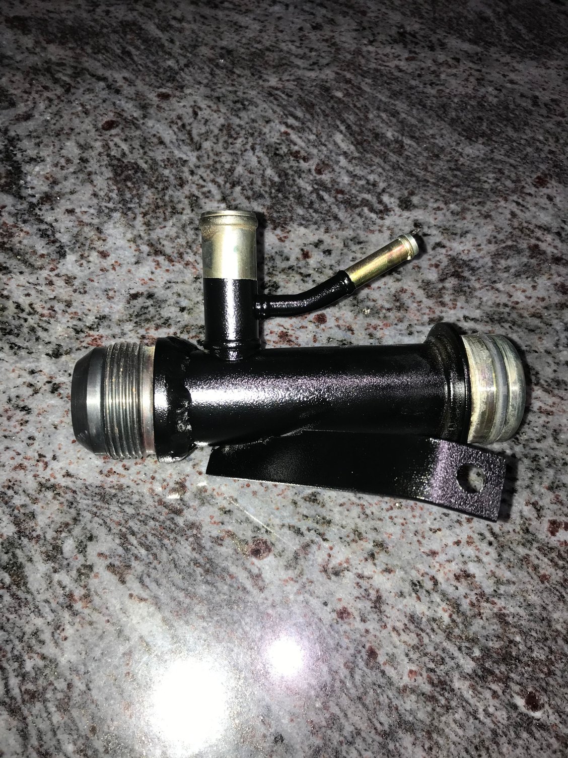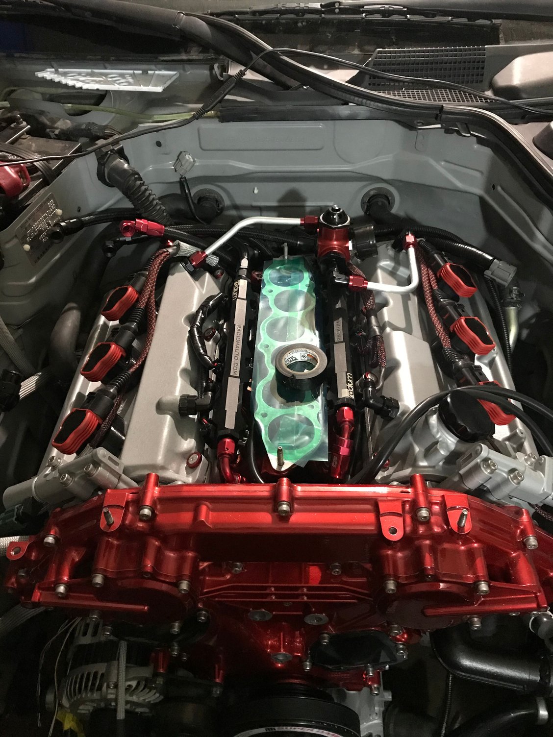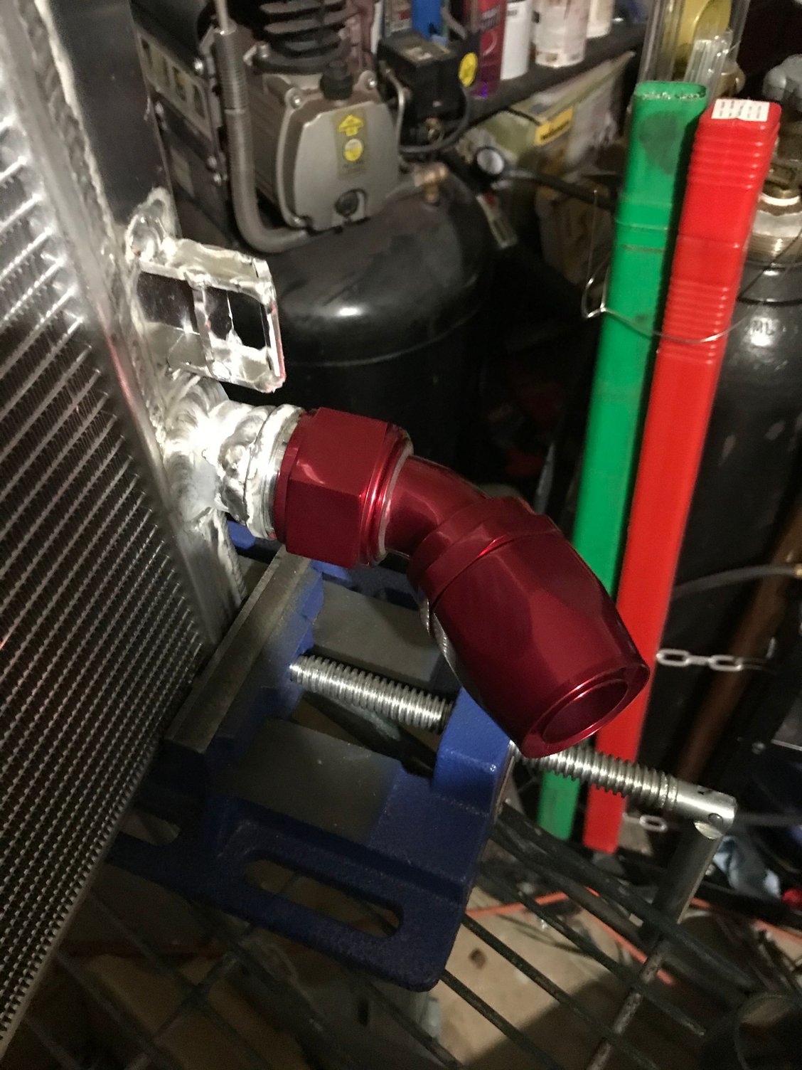 I chose anodized fittings that matched the powder coat for the front fuel rail lines Feed and return of the FPR Test fitting for clearance Throttle just nearly fits over the valve cover fittings FTW Disassembly of the thermostat before welding -20 fitting welded Powder coated black Also powder coated black I added an extra support bracket to the pipe to support it as the AN is significantly more rigid than the oem line and I had to cut the oem block mount off Testing the crank evac system, the exa pump maxed out at about 23inhg of vacuum but I don’t plan to run it that high, here I have the Vacuum regulator set to it’s lowest setting and I’ll keep it here for now. If I decide I need more later I can always turn it up but I don’t really want or need too much Manifold is on for keeps now Welded the bungs to the aluminum radiator Starting assembling the front end, I won’t fully reassemble it until the engine is running but I needed the radiator mount in place to assemble the radiator lines before the test start How she sits heading into the weekend, on a side note with the aluminum radiator and the shallow mount fan shroud I have more room in between the engine and radiator than before and it serves to show off the timing cover nicely