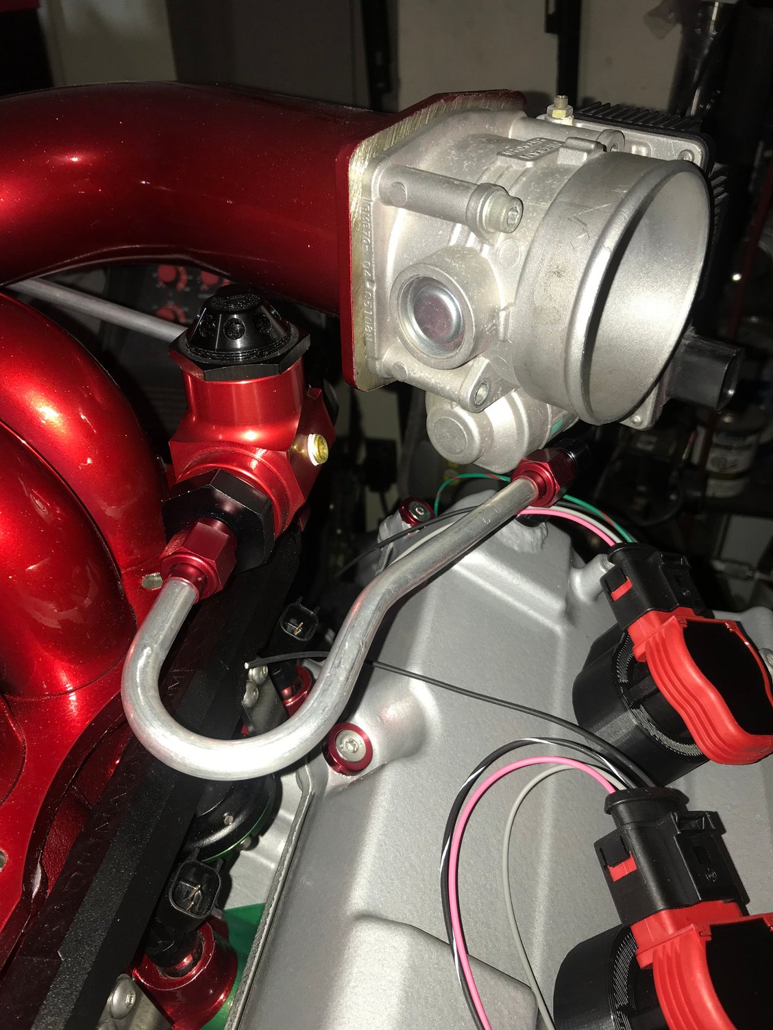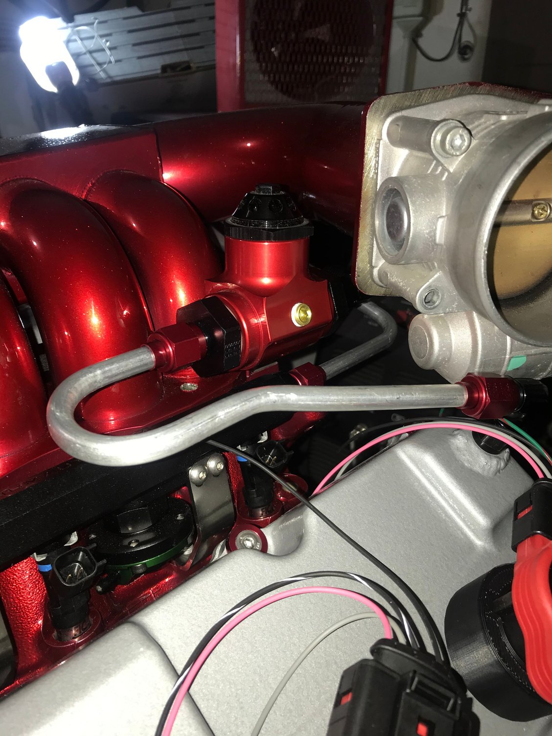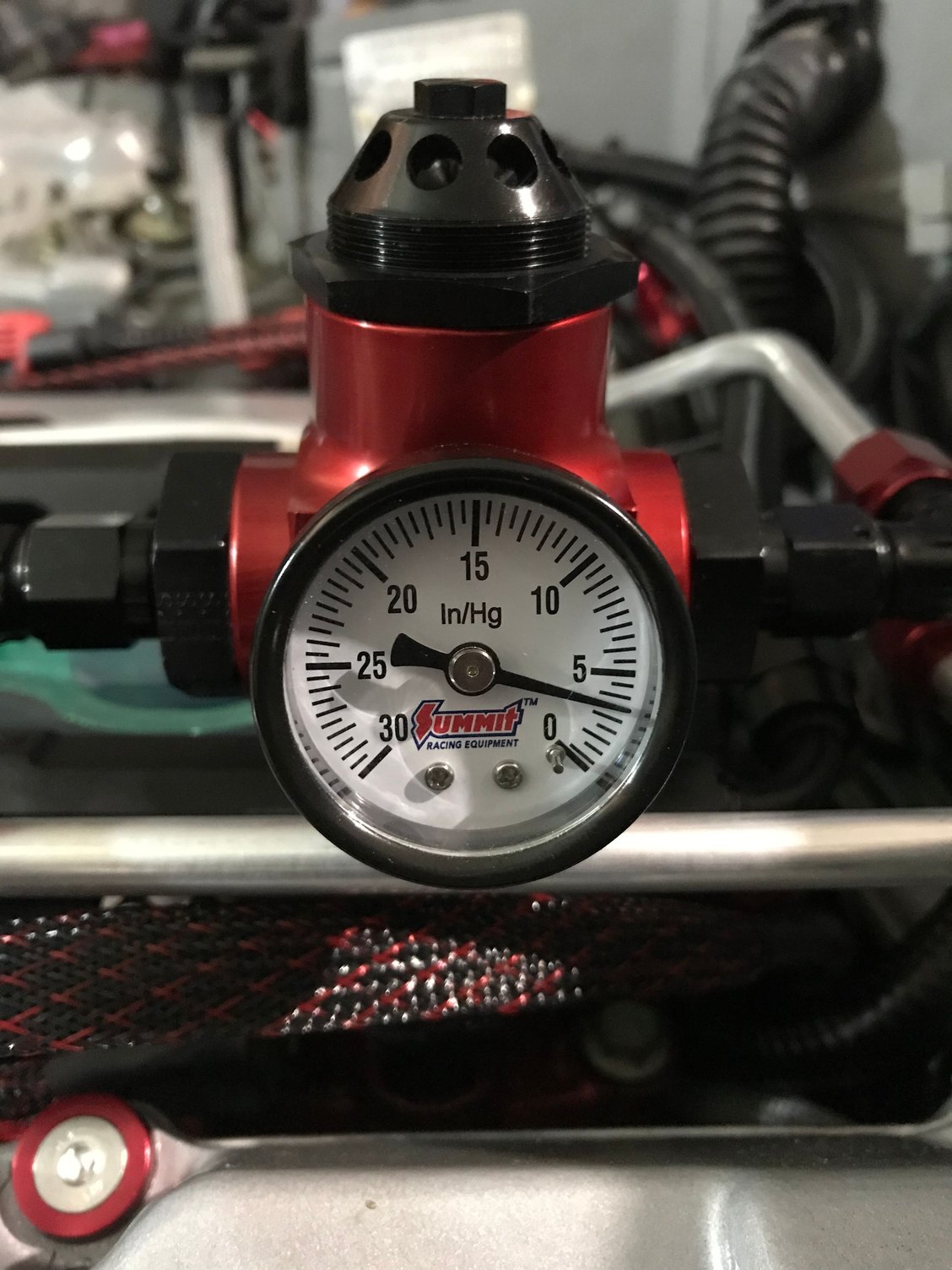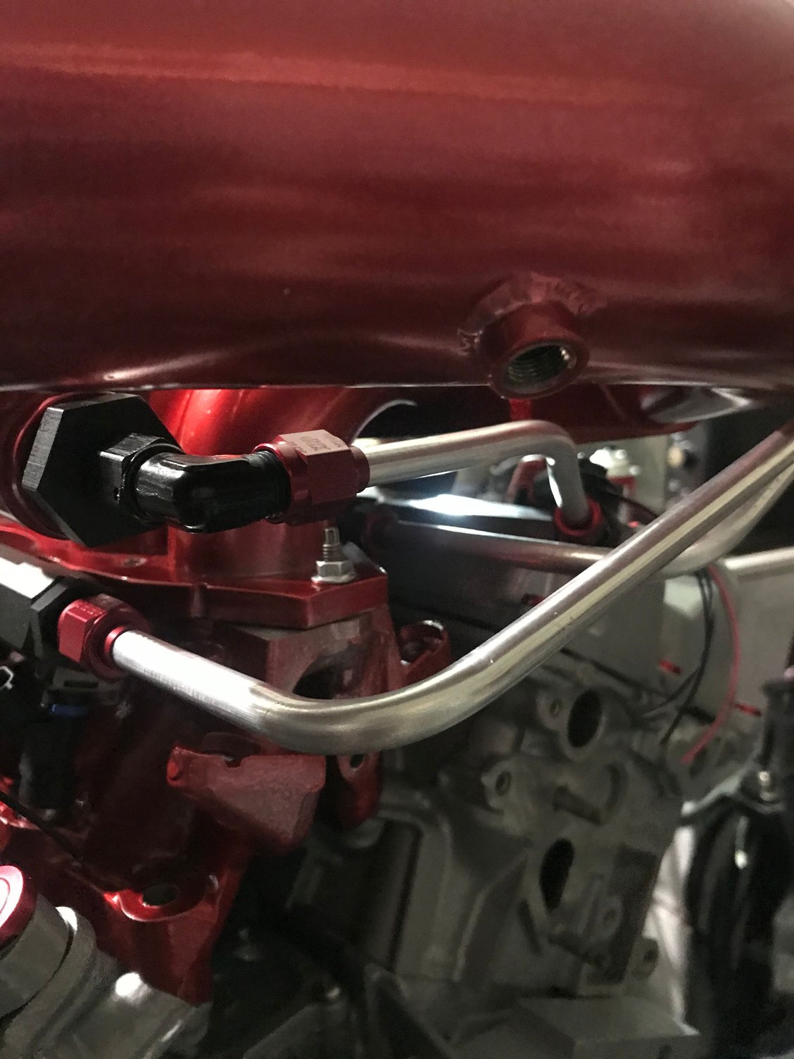 I started mocking up the hardline for the vacuum regulator I’m not particularly happy with the connection to the drivers side bank it seams really busy so I think I’ll go back and get a 90* adapter to reduce the noise so to speak
