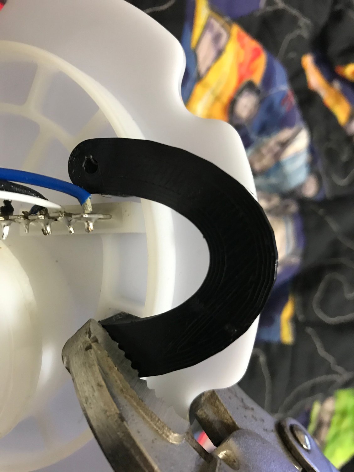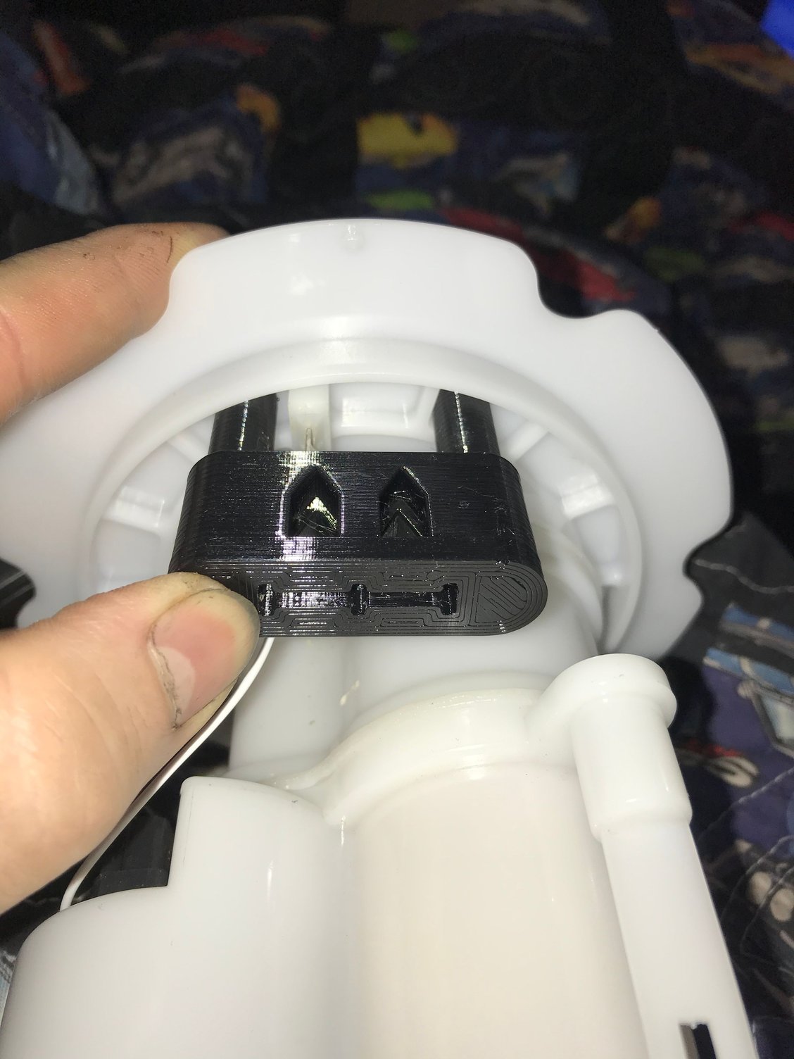 This is a bracket printed from PETG This is a template for drilling mounting holes for the bracket The drilled holes Viton seals around the mounting standoff’s to prevent fuel leaking out Decided to adjust the wires positioning to allow for more clearance on the bracket The bracket and canister fitted with the drivers side level sender I wanted to test the durability of the PETG soaking in gasoline. It should be completely impervious to the gasoline but I prefer to do things the Russian way “trust but verify” After 2 weeks of soaking there is no compromise in strength or shape and no evidence of the gasoline having an affect on the material