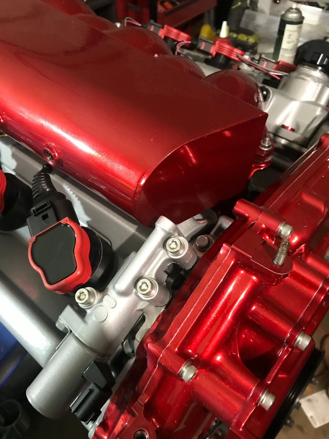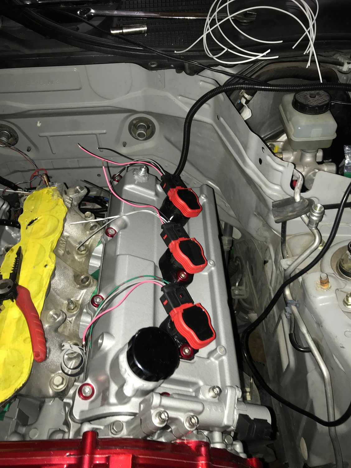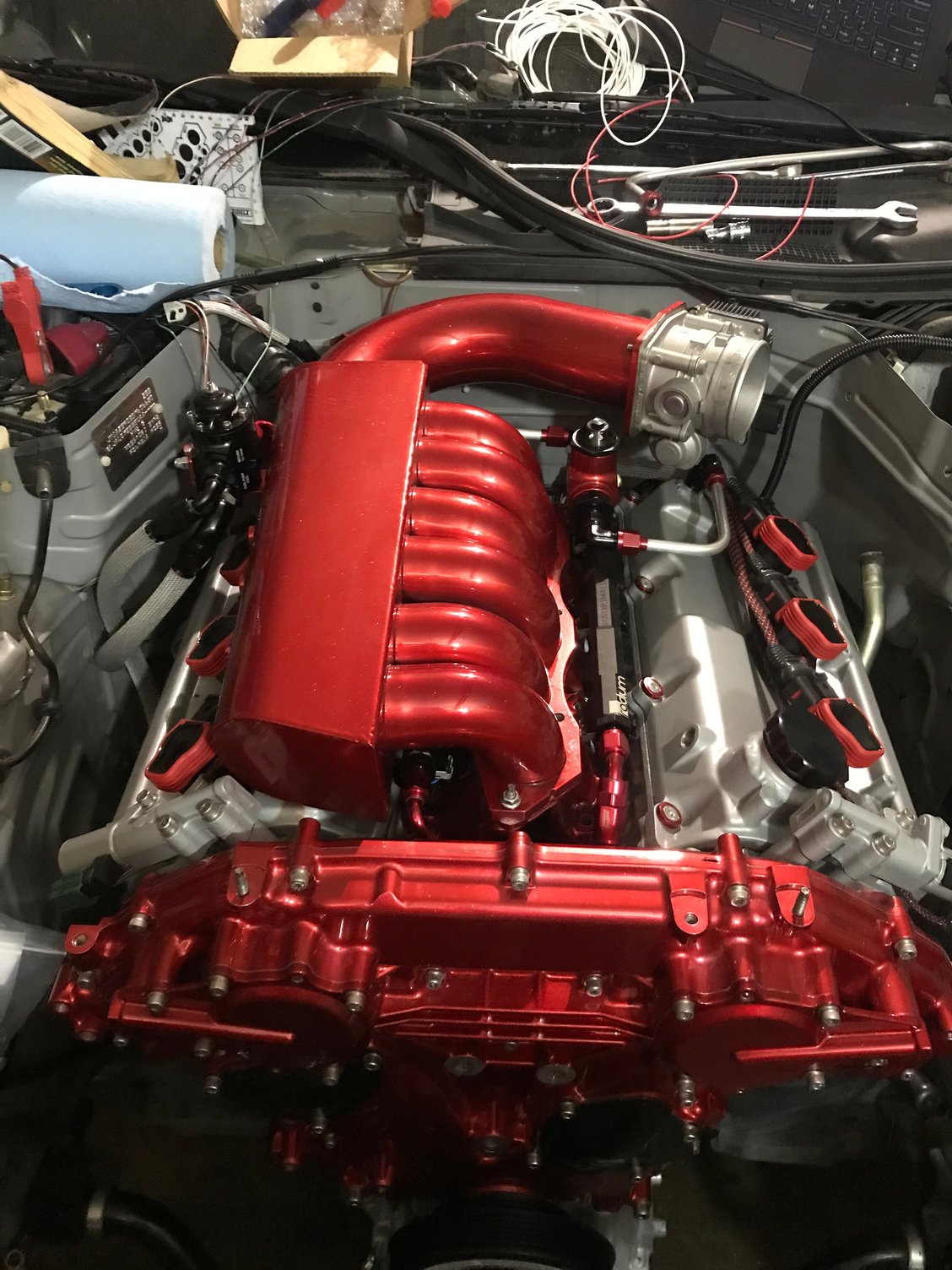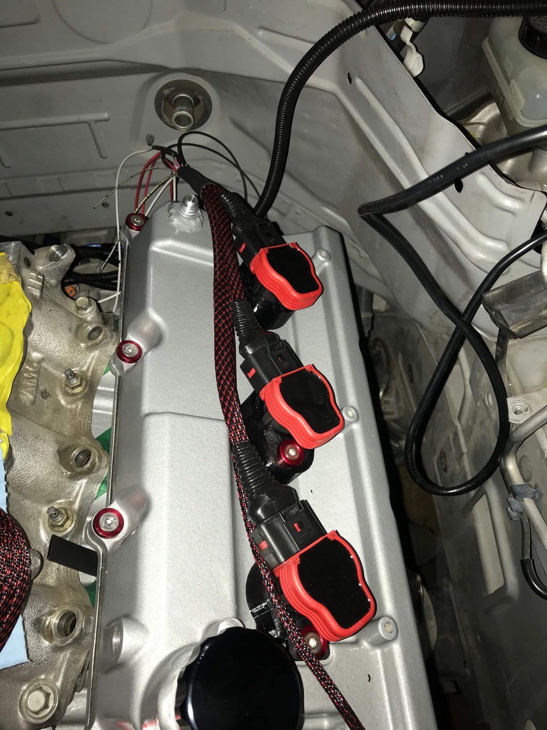 Starting the wiring for the coil packs Wrapped in fire resistant sleeves with a neat pattern Test fitting the manifold and injection, unfortunately I’m not going to be able to use the hardline fuel lines at all as the main harness exit from the fire wall requires lower clearance so I’m just going with soft line to the rails both to and from 😞 Here is a teaser photo of the turbo in place but after tearing through the engine bay I decided I wanted to change the manifolds so that they don’t run right next to the beautiful timing cover. The turbo location won’t change but the wastegates will move to the back and make more room for turbo intake and output