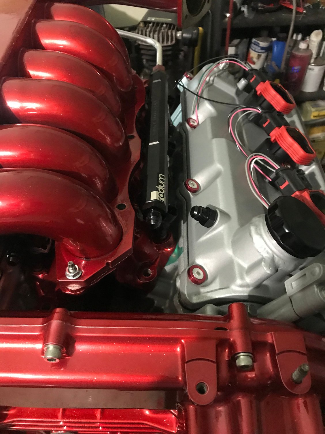 Little update, I’ve been playing with the manifold and air lines and fuel hoses. Once I got the lower collector in place with the fuel rails and lines it became apparent that the front fuel rail lines weren’t going to work so I had to ditch them, I’m going to run soft AN line to the front of the rails and keep the hard line at the rear.