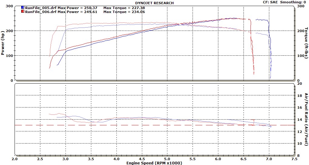 As for the power differences, here is a graph of my car on the dyno. Blue is 4th gear, and red is 5th gear(it cuts off early due to the sedan's speed limiter). The runs were two minutes apart.
