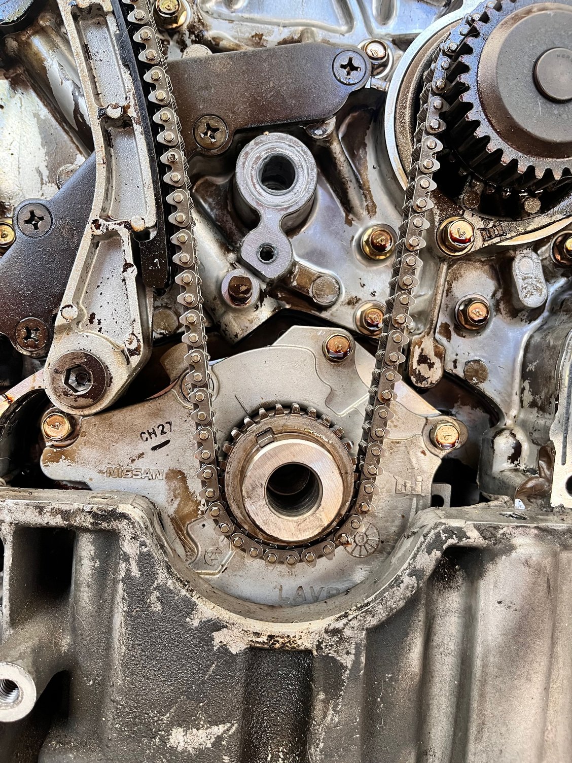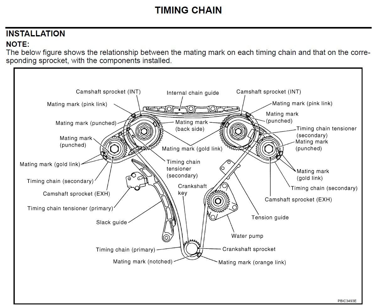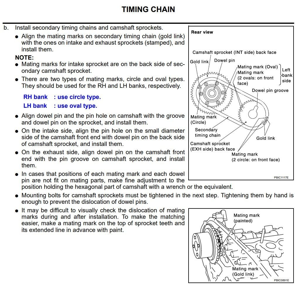 Hello i have a 165k miles de 350z Im doing the gallery gaskets, the secondary timing chain marks won't line up I did spin the engine multiple times counterclockwise when trying to line up before, but only in small increments. I'm worried one of them may have jumped timing. If that's the case, can anyone verify. When i line up the right side secondary mark everything is cleaner and very clear like in the photos but when i line up the left side secondary since only one or the other line up not both its not dead lined up as to say.
