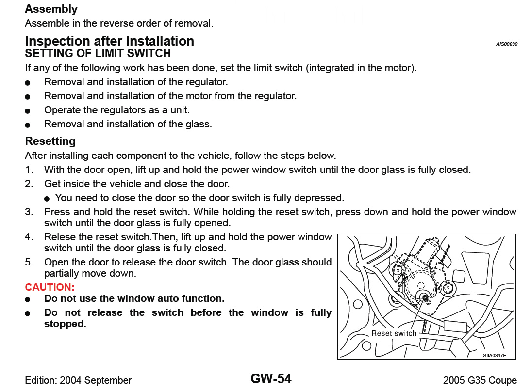 damn sounds like too much work i would try before pulling the panel..get in your car press and hold the switch like albert said untill the window is all the way down + 5 seconds and then pull and hold the switch up + 5 seconds and see if that works. i know it isn't a toyota or mitsubishi but the scion tc's and eclipse's work that way for reinitilizing them! GL