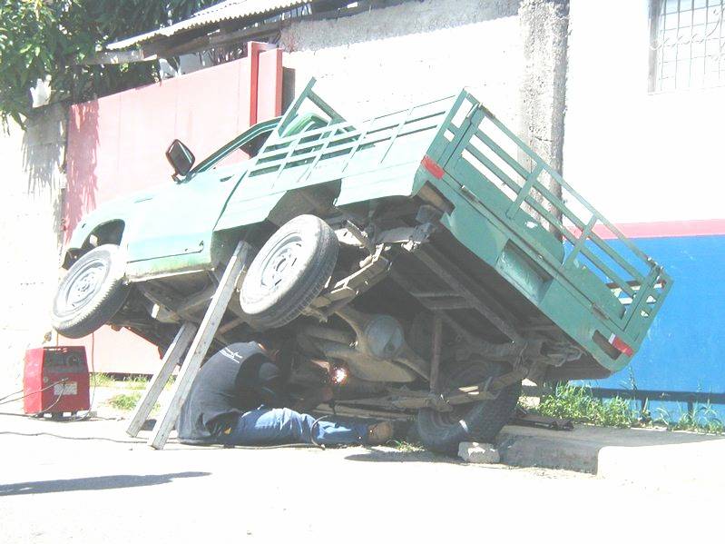 Lets see: he's using 4x4s to support a truck while he's welding a gas tank. That rock he's using as a wheel choke is really adding to the safety factor too.
