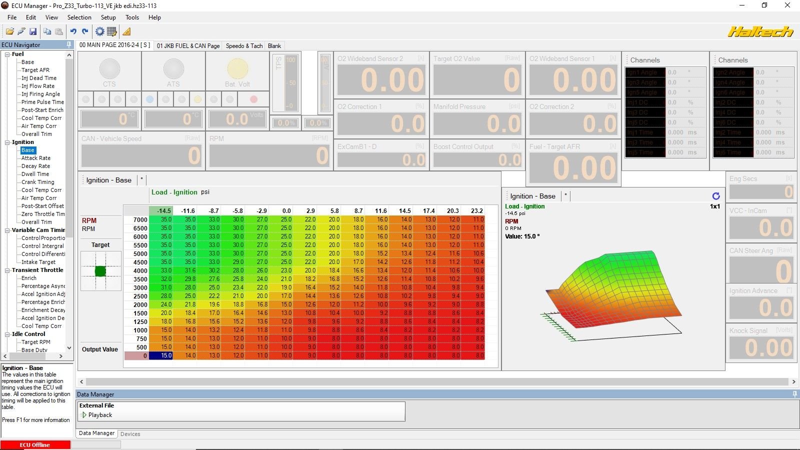 In addition, Haltech has (or had in my case) bug with conditioning generic correction tables (both fuel and ignition), they are (were) activated no matter condition is met or not. Well, after more than a year asking and begging for a fix, I got fixed firmware thanks to Matthew who stands for me in front of Haltech development. Take in consideration too that Pro PlugIn is pretty old platform today, there are harness for PnP their newer Elite ECU to 350Z and it is way better ECU! It has ton's of new features plus most of (if not all) things mentioned here are fixed or done better way.
