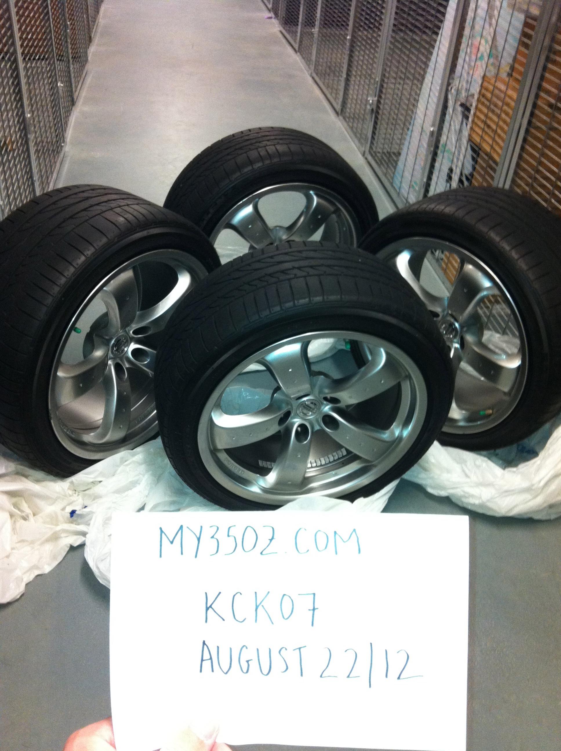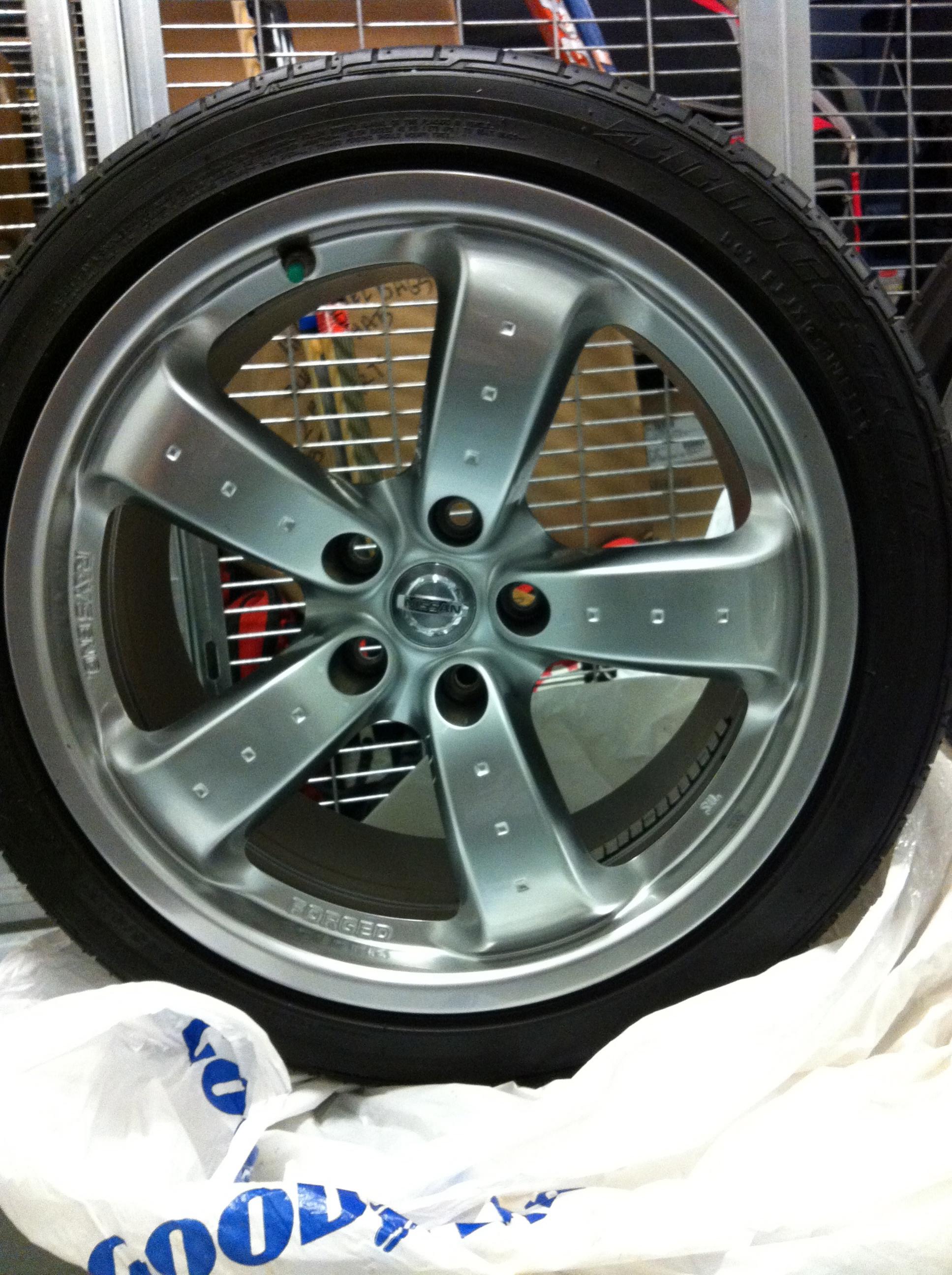 4 Factory FORGED RAYS ENG. WHEELS/RIMS off of a 2008 Nissan 350Z GT (Grand Touring). The rims have 5000 kilometres on them, each coming with the 2008 model year Nissan factory TPMS installed. I also have the Nissan centre cap and lug nuts for each wheel if needed..... all wrapped in Bridgestone Potenza RE 050A tires also with 5000 kilometres on them and 85% + tread left. These wheels and tires are both top of the line, and in excellent condition. Both front wheels have very light rash on the outer ring of the rim, but nothing that can not be easily buffed out. There is absolutely no bends. These are the most top of the line factory wheel that ever came available on any 350z model year.
